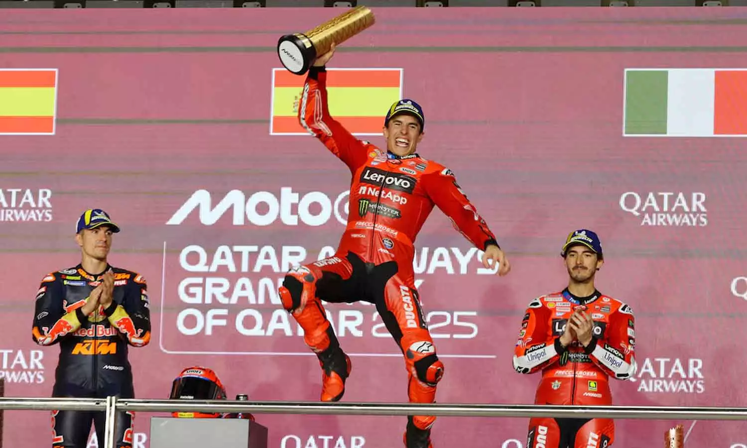 ശനിയാഴ്ച നടന്ന ക്വാളിഫയിങ്, സ്പ്രിന്റ് റേസുകളിലെ മികവ് ഡുകാത്തിയുടെ സ്പാനിഷ് താരം ഫൈനൽ പോരിലും ആവർത്തിച്ചു. തുടക്കത്തിൽ സഹോദരൻ അലക്സ് മാർക്വസുമായി കോണ്ടാക്ട് വന്നത് ആശങ്കയുണ്ടാക്കിയെങ്കിലും വിജയം കൈവിട്ടില്ല. ഇറ്റാലിയൻ താരം ഫ്രാൻസിസ്കോ ബഗ്നയയാണ് രണ്ടാം സ്ഥാനത്ത്.