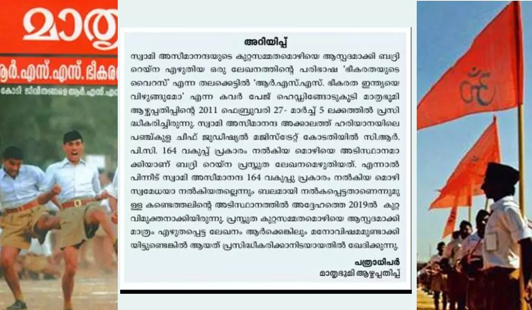 ' സ്വാമി അസീമാനന്ദ 164 വകുപ്പ് പ്രകാരം നൽകിയ മൊഴി സ്വമേധയാ നൽകിയതല്ലെന്നും ബലമായി നൽകപ്പെട്ടതാണെന്ന് കണ്ടെത്തിയിരുന്നു. 2019 ൽ അദ്ദേഹത്തെ കുറ്റവിമുക്തനാക്കുകയും ചെയ്തു. പ്രസ്തുത കുറ്റസമ്മതമൊഴിയെ ആസ്പദമാക്കി മാത്രം എഴുതപ്പെട്ട ലേഖനം ആർക്കെങ്കിലും മനോവിഷമമുണ്ടാക്കിയിട്ടുണ്ടെങ്കിൽ ഖേദിക്കുന്നെന്നും' മാതൃഭൂമി ആഴ്ചപ്പതിപ്പ് പത്രാധിപർ അറിയിച്ചു.