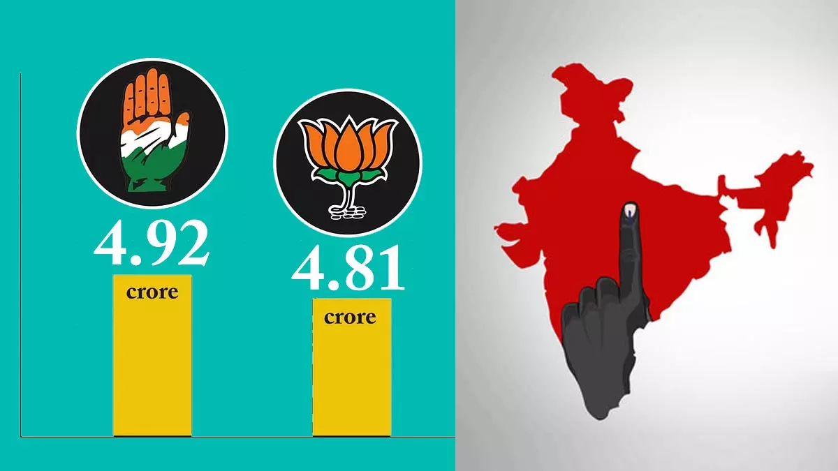 ആകെ വോട്ടിന്റെ എണ്ണം പരിശോധിച്ചാല് ബി.ജെ.പി 48,16,8,987 വോട്ടുകളും കോണ്ഗ്രസ് 49,22,4,020 വോട്ടുകളുമാണ് നേടിയത്. ബി.ജെ.പി നേടിയതിനേക്കാള് 10,55,033 വോട്ട് കൂടുതല് കോണ്ഗ്രസിന് ലഭിച്ചു എന്നര്ഥം. കോണ്ഗ്രസിനെ സംബന്ധിച്ച് ആകെ തകര്ന്നു എന്ന സന്ദേശമല്ല ഈ തെരഞ്ഞെടുപ്പ് നല്കുന്നത്.