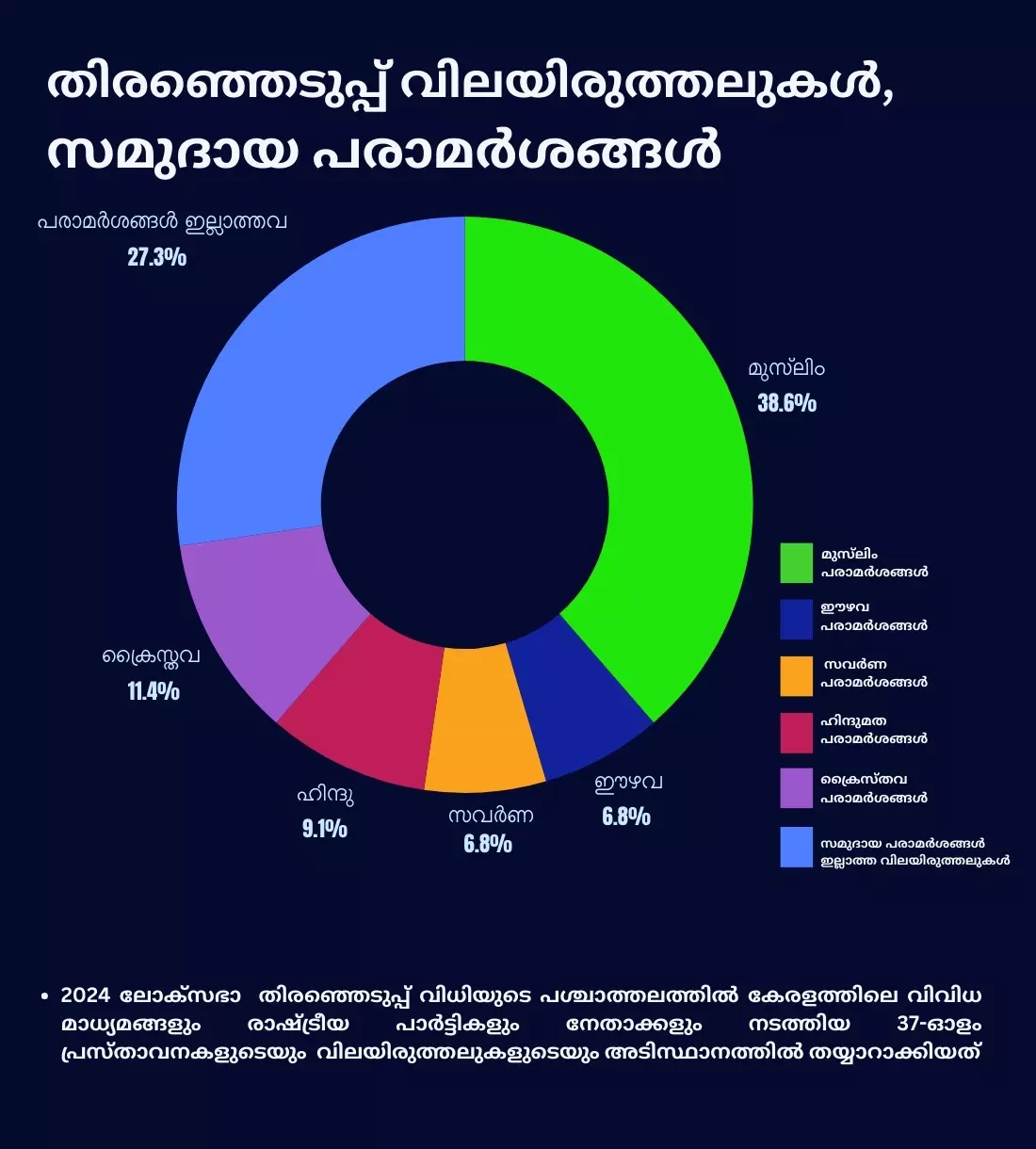 വോട്ടര്മാരെ മതപരമായി തിരിച്ചറിയുന്ന രീതി പലരും ഉപയോഗപ്പെടുത്തിയിട്ടുണ്ട്. മാധ്യമ വിശകലനങ്ങളിലും അത് കണ്ടിരുന്നു. മതപരമായ സൂചനകള് മുസ്ലിംകളിലും ക്രൈസ്തവരിലും ഒതുങ്ങിനിന്നു. ഹിന്ദുത്വസ്വാധീനത്തെക്കുറിച്ച് മിക്കവാറും നേതാക്കള് ആവര്ത്തിച്ചിരുന്നെങ്കിലും ഹിന്ദു വോട്ടര്മാരെക്കുറിച്ച് സൂചിപ്പിച്ച അപൂര്വം ഒരാള് ആറ്റിങ്ങലിലെ ഇടത് സ്ഥാനാര്ഥിയാണ്. അദ്ദേഹം വോട്ടര്മാരുടെ ഹൈന്ദവവത്കരണത്തെക്കുറിച്ചും പറഞ്ഞു.