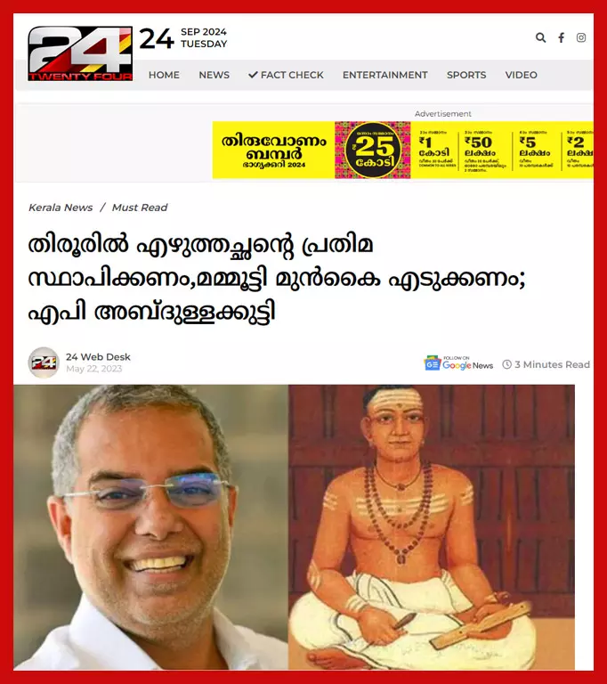 തിരൂരില് എഴുത്തച്ഛന്റെ പ്രതിമ സ്ഥാപിക്കാത്തത് ഇസ്ലാമിക തീവ്രവാദികളുടെ ഭീഷണി ഭയന്നാണെന്നായിരുന്നു ബിജെപി നേതാവ് എ.പി അബ്ദുല്ലക്കുട്ടിയുടെ ആരോപണം. പ്രതിമ സ്ഥാപിക്കാന് നടന് മമ്മുട്ടി മുന്കയ്യെടുക്കണമെന്നും അദ്ദേഹം ആവശ്യപ്പെട്ടു: ''മലയാള ഭാഷയുടെ പിതാവ് തുഞ്ചത്ത് എഴുത്തച്ഛന് ആദരം നല്കാന് നിങ്ങള് ആരെയാണ് പേടിക്കുന്നത്?! തുഞ്ചന്പറമ്പില് എഴുത്തച്ഛന്റെ പ്രതിമ സ്ഥാപിക്കാന് പിണറായിക്ക് ധൈര്യമുണ്ടോ? ഈ വിഷയത്തില് മമ്മൂട്ടിക്ക് എന്ത് പറയാനുണ്ട്? പ്രതിമ ഞങ്ങള് മുസ്ലിംകള്ക്ക് ഹറാമാണ് എന്ന് പ്രചരിപ്പിക്കുന്നത് പച്ചക്കള്ളമാണ്. ഇത് ഇസ്ലാമിക തീവ്രവാദികളുടെ ആശയമാണ്. ഏത് പോലെ എന്നാല് സിനിമ ഹറാമാണ് എന്ന് പണ്ട് ഇവിടെ നിലനിന്ന അന്ധവിശ്വാസംപോലെ. ഇനിയെങ്കിലും വൈകാതെ തിരൂര് മുന്സിപ്പാലിറ്റിയുടെ ഏണിക്കടിയില് പൊടിപിടിച്ച് കിടക്കുന്ന ഒരു വെങ്കല പ്രതിമയുണ്ട്. മഹാനായ ഭാഷാപിതാവിന്റെ പ്രതിമ. അത് സ്ഥാപിക്കാന് മഹാനടന് മമ്മൂട്ടി മുന്കൈ എടുക്കണം. അങ്ങയ്ക്ക് പിണറായി വിജയനിലുള്ള സ്വാധീനം ഉപയോഗപ്പെടുത്തണം. ഇത് ഒരു അപേക്ഷയാണ്. ഇതുപോലെ പണ്ട് ലക്ഷദ്വീപിലെ ഒരു പഴയ രാഷ്ട്രീയ നേതാവ് പ്രതിമ ഇസ്ലാമിനെതിരാണെന്ന് നുണ പറഞ്ഞ് ദ്വീപില് ഗാന്ധിയുടെ പ്രതിമ സ്ഥാപിക്കുന്നത് തടഞ്ഞിരുന്നു. ഇന്ന് അവിടെ ഗാന്ധിയുടെ പ്രതിമ സ്ഥാപിച്ചു. നിങ്ങള്ക്ക് കവരത്തിയില് പോയാല് കാണാം ഗാന്ധിദിനത്തില് പ്രതിമയ്ക്ക് മുന്നില് പുഷ്പാര്ചന നടത്തുന്ന നിസ്ക്കാരത്തഴമ്പുള്ള നല്ല മുസ്ലിം സഹോദരങ്ങളെ.'' (തിരൂരില് എഴുത്തച്ഛന്റെ പ്രതിമ സ്ഥാപിക്കണം, മമ്മൂട്ടി മുന്കൈ എടുക്കണം; എ.പി അബ്ദുല്ലക്കുട്ടി, 24 ന്യൂസ്, മെയ് 22, 2023)
