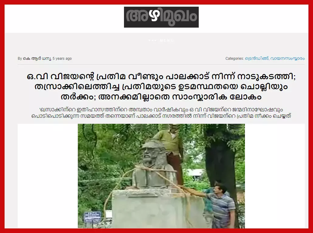 അടുത്ത പ്രതിമാവിവാദം നടക്കുന്നത് പാലക്കാട്ടുനിന്നാണ്. അതും ഒ.വി വിജയന്റെ പ്രതിമതന്നെ. ആദ്യ വിവാദം 2016ലും രണ്ടാം വിവാദം 2019ലുമാണ് നടന്നത്. പാലക്കാട് കെഎസ്ആര്ടിസി ജംഗ്ഷനില് ഒ.വി വിജയന്റെ ഒരു പ്രതിമ സ്ഥാപിച്ചിരുന്നു. 2016ല് ഇത് പെട്ടെന്ന് അപ്രത്യക്ഷമായി. തിരച്ചിലുകള് നടന്നെങ്കിലും കണ്ടെത്താനായില്ല. റോഡ് വികസനത്തിന്റെ ഭാഗമായാട്ടായിരിക്കണം പ്രതിമ കാണാതായതെന്ന ഒരു വിശദീകരണം ആ കാലത്ത് നഗരസഭ നല്കിയിരുന്നു. എന്നാല്, പ്രതിമ മാറ്റാന് ഉത്തരവൊന്നും നല്കിയിരുന്നില്ല. പ്രതിമ കണ്ടെത്താനും കഴിഞ്ഞില്ല. പിന്നീട് നഗരസഭാ വളപ്പില് മാലിന്യക്കൂമ്പാരത്തിനിടയില് നിന്ന് പ്രതിമ കണ്ടെത്തി.