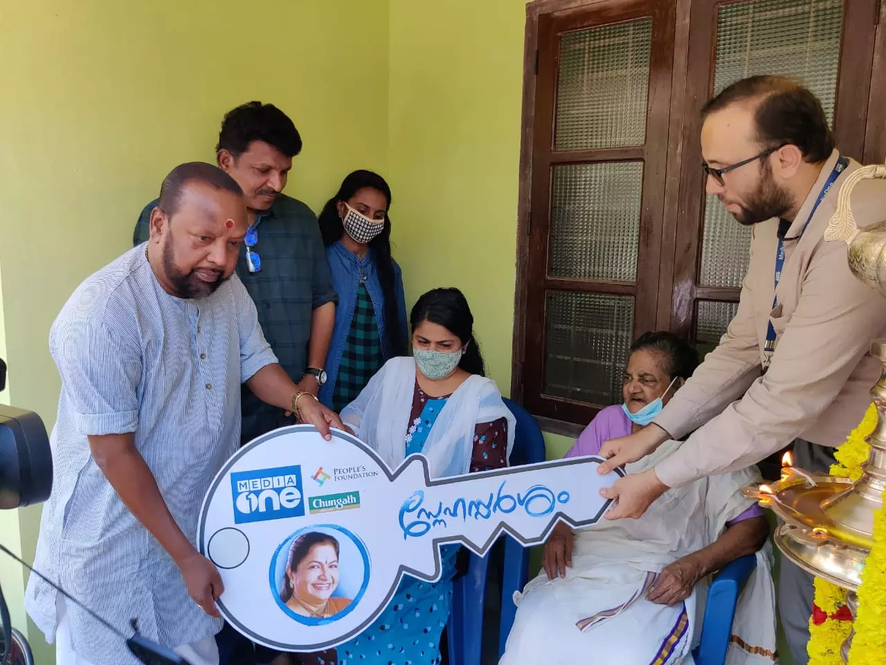 മീഡിയവൺ സ്നേഹസ്പർശം മുപ്പത്തി മൂന്നാമത് ഭവനം സംഗീത സംവിധായകൻ വിദ്യാധരൻ മാസ്റ്റർ കൈമാറുന്നു. മീഡിയവൺ കമ്യൂണിക്കേഷൻ ഓഫീസർ പി.ബി.എം ഫർമീസ് സമീപം