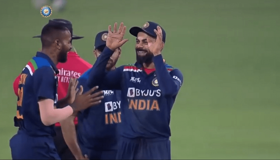 ഇംഗ്ലണ്ട് ഇന്നിങ്സിലെ പത്താം ഓവറിലായിരുന്നു നാടകീയമായ ആഘോഷ നിമിഷങ്ങള്. നടരാജന്റെ ബൌളില് ബൌണ്ടറിക്കരികെ ധവാന് ക്യാച്ച് നല്കിയായിരുന്നു സ്റ്റോക്സിന്റെ മടക്കം. 35 റണ്സുമായി സ്റ്റോക്സ് പുറത്താകുമ്പോഴേക്കും ഇന്ത്യന് താരങ്ങള് ആഘോഷം തുടങ്ങിയിരുന്നു.
