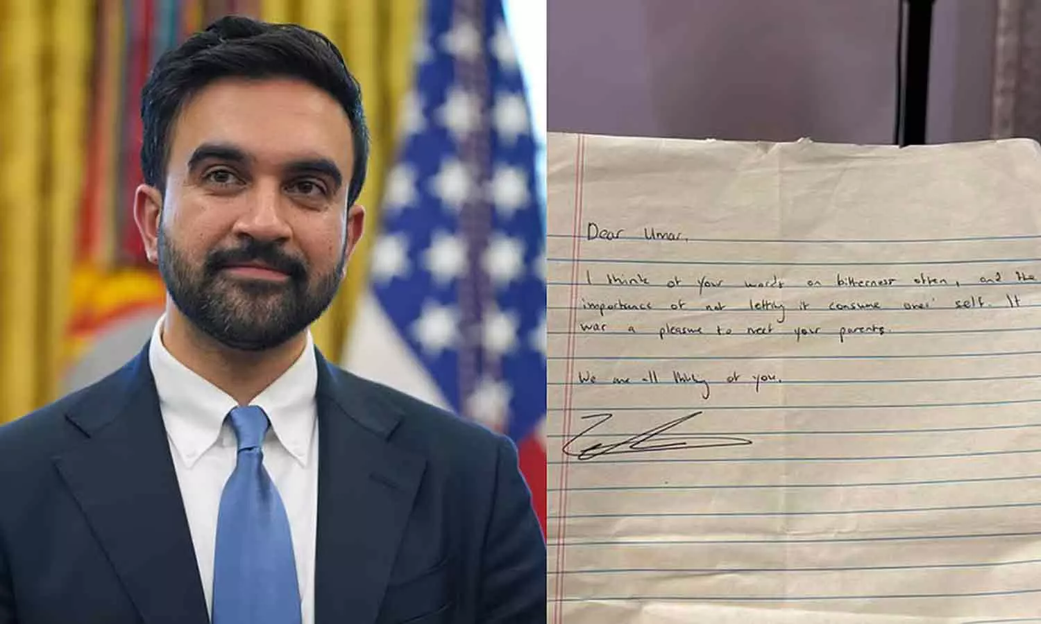ന്യുയോർക്ക് മേയറായി സൊഹ്ദാൻ മംദാനി സത്യപ്രതിജ്ഞ ചെയ്ത് സ്ഥാനമേൽക്കുന്ന അന്നാണ് ഉമർഖാലിദിന്റെ സുഹൃത്തുക്കൾ ന്യയോർക്ക് മേയർ ഉമറിന് അയച്ച കത്ത് സമൂഹമാധ്യമങ്ങളിലൂടെ പങ്കുവെച്ചത്. മംദാനിയുടെ കത്ത് ഇങ്ങനെയായിരുന്നു- 'പ്രിയപ്പെട്ട ഉമർ, കയ്പിനെ കുറിച്ചും സ്വയം നശിപ്പിക്കപ്പെടാതിരിക്കേണ്ടുന്നതിന്റെ പ്രാധാന്യത്തെ കുറിച്ചുമുള്ള നിങ്ങളുടെ വാക്കുകൾ ഞാൻ ഓർക്കാറുണ്ട്. നിങ്ങളുടെ മാതാപിതാക്കളെ കണ്ടുമുട്ടാൻ കഴിഞ്ഞതിൽ സന്തോഷം'. മംദാനി കത്തിൽ കുറിച്ചു. ഞങ്ങളുടെ എല്ലാവരുടെയും ചിന്തയിൽ നീയുണ്ടെന്ന് പറഞ്ഞാണ് അദ്ദേഹം കത്ത് അവസാനിപ്പിച്ചത്.