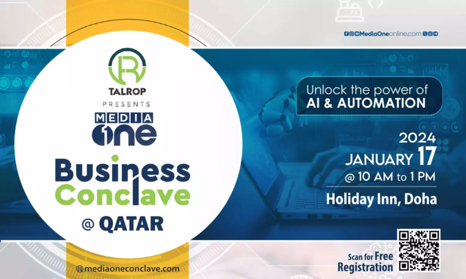 2024 ജനുവരി 17ന് ദോഹ ഹോളി ഡേ ഇൻ ഹോട്ടലിൽ രാവിലെ 10 മുതൽ ഉച്ചക്ക് 1: 00 മണി വരെ നടക്കുന്ന ബിസിനസ് കോൺക്ലേവിൽ നിങ്ങൾക്കും പങ്കെടുക്കാം. എ.ഐ മേഖലയിലെ അന്താരാഷ്ട്ര വിദഗ്ധർ, ഖത്തറിലെ ടെക് വിദഗ്ധർ, ടെക് സംരംഭകർ, മുതിർന്ന മാധ്യമ പ്രവർത്തകർ എന്നിവരെല്ലാം കോൺക്ലേവിൽ പങ്കെടുക്കും.