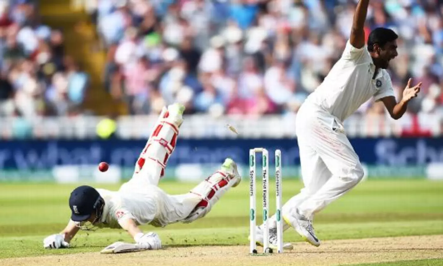 ഇംഗ്ലണ്ട് ശക്തമായ നിലയിലേക്ക് നീങ്ങുമ്പോഴായിരുന്നു കോഹ്ലിയുടെ മികച്ച ത്രോ റൂട്ടിനെ റണ്ണൗട്ടാക്കിയത്. ഡബിളിനുവേണ്ടി ഓടിയ റൂട്ട് റണ്സ് പൂര്ത്തിയാക്കും മുമ്പേ കോഹ്ലി വിക്കറ്റ് തെറിപ്പിച്ചു. ബൗളറായ അശ്വിന് നോക്കി നില്ക്കേണ്ട കടമയേ ഉണ്ടായിരുന്നുള്ളൂ. ഇതുവരെ ഇന്ത്യക്കുവേണ്ടി അശ്വിനും ഷമിയും രണ്ട് വിക്കറ്റ് വീതം നേടിയിട്ടുണ്ട്. ഈ റണ്ണൗട്ടിന് പിന്നാലെ ബെയര്സ്റ്റോയുടെ വിക്കറ്റ് തെറിപ്പിച്ച് ഉമേഷ് യാദവ് ഇംഗ്ലീഷ് തകര്ച്ചക്ക് വേഗം കൂട്ടി.