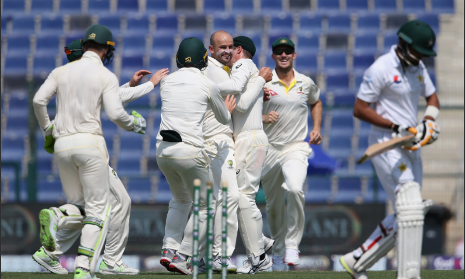 19ാം ഓവറിലെ അഞ്ചാം പന്തോടെയാണ് വിക്കറ്റ് വീഴ്ച ആരംഭിക്കുന്നത്. അസ്ഹര് അലിയാണ് ആദ്യം പുറത്തായത്. അസ്ഹര് അലിയെ റിട്ടേണ് ക്യാച്ചിലൂടെ ലയോണ് തന്നെ മടക്കി. പിന്നാലെ എത്തിയ ഹാരിസ് സുഹൈലും തൊട്ടടുത്ത പന്തില് പുറത്ത്. ട്രാവിസ് ഹെഡാണ് സുഹൈലിനെ ക്യാച്ചിലൂടെ പുറത്താക്കിയത്. അതോടെ ലയോണിന്റെ ആ ഓവര് കഴിഞ്ഞു. പിന്നെ പന്തെറിഞ്ഞത് ഹോളണ്ട്. വിക്കറ്റൊന്നും വീഴാതെ പാകിസ്താന് ഹോളണ്ടിന്റെ ഓവര് പിടിച്ചുനിന്നു. 21ാം ഓവര് ലയോണ് തന്നെ എറിയാനെത്തി. ആദ്യ പന്ത് ആസാദ് ഷഫീഖ് പ്രതിരോധിച്ചു. രണ്ടാം പന്തില് ഷഫീഖിനെ സില്ലിപോയിന്റില് ലാബസ്ചാഗ്നെ പിടികൂടി.