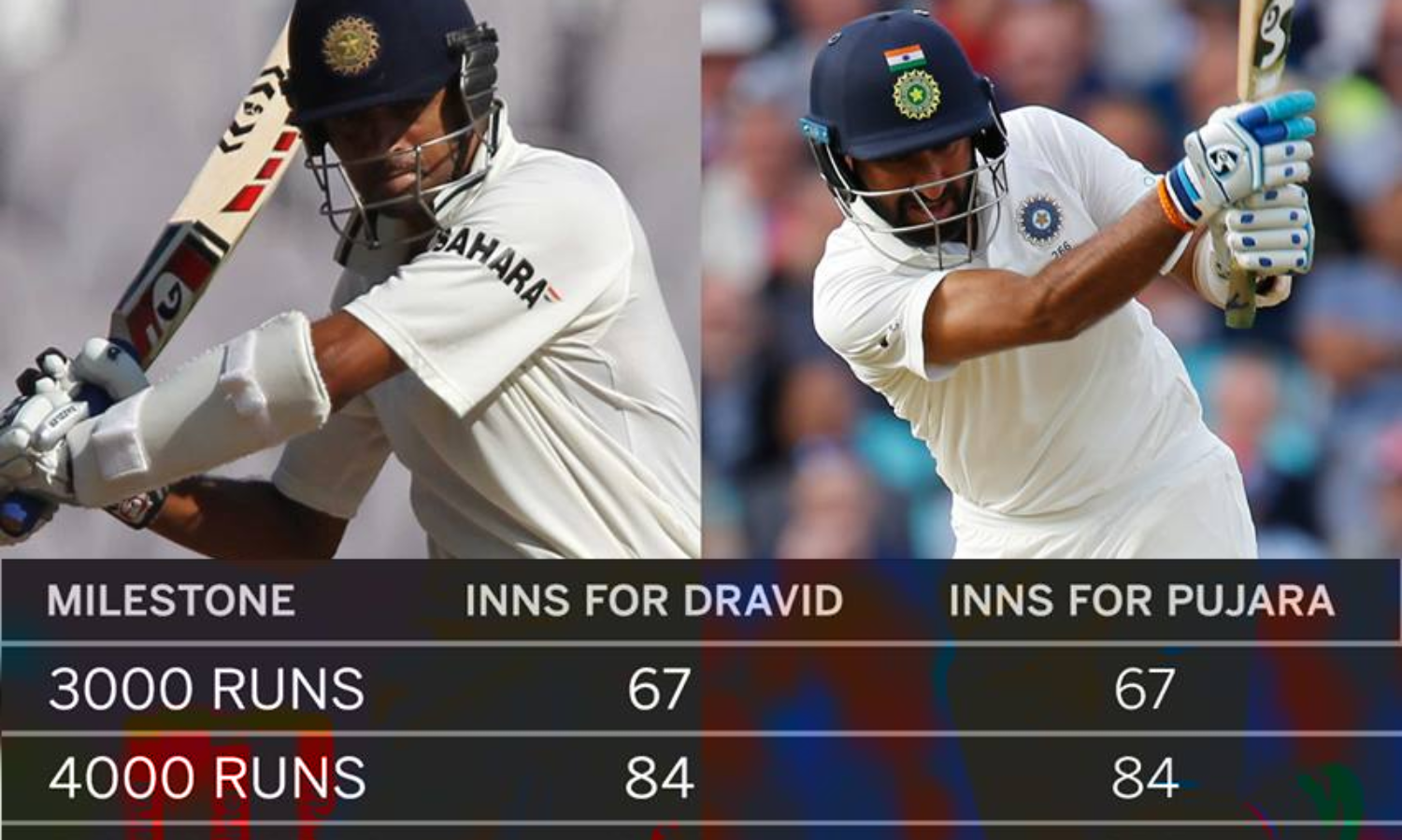 അവിചാരിതമെങ്കിലും ദ്രാവിഡിനോട് തോളോടു തോള് ചേര്ന്നാണ് പുജാരയും ടെസ്റ്റില് മുന്നേറുന്നത്. ഇരുവരും 108 ഇന്നിംങ്സുകളില് നിന്നാണ് 5000 ടെസ്റ്റ് റണ്ണുകള് നേടിയത്