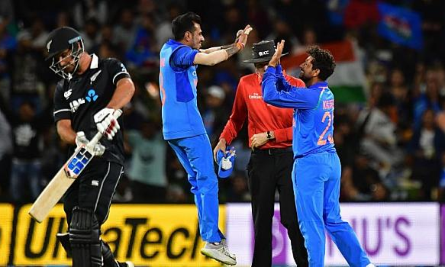 നാലു വിക്കറ്റ് വീഴ്ത്തിയ കുല്ദീപ് യാദവാണ് കിവീസ് ബാറ്റിംഗിന്റെ നടുവൊടിച്ചത്. ഭുവനേശ്വർ കുമാറും യൂസ്വേന്ദ്ര ചഹാലും രണ്ടു വിക്കറ്റുകള് വീഴ്ത്തിയപ്പോള്, മുഹമ്മദ് ഷമി, കേദാർ ജാദവ് എന്നിവർ ഓരോ വിക്കറ്റ് വീതവും നേടി.