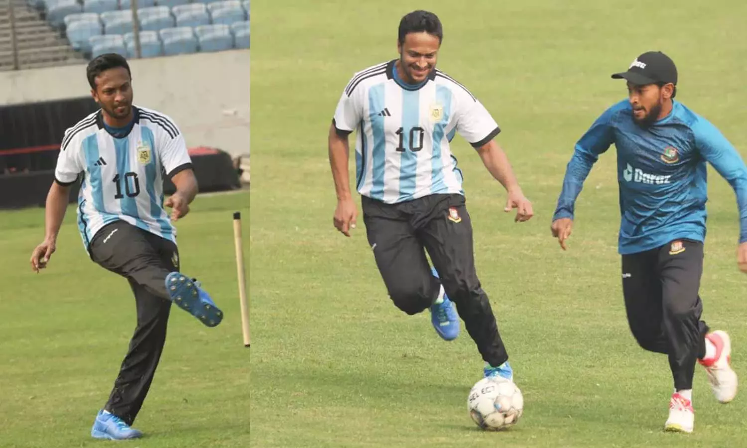 അർജന്റീന ആരാധനയിൽ ബംഗ്ലാ ക്രിക്കറ്റ് താരങ്ങളും ഒട്ടും പിന്നിലല്ലെന്നു വ്യക്തമാക്കുന്നതാണ് കഴിഞ്ഞ ദിവസം പുറത്തുവന്ന സ്റ്റാർ ഓൾറൗണ്ടർ ഷക്കീബുൽ ഹസന്റെ ഒരു ചിത്രം. ഇന്ത്യയ്ക്കെതിരായ രണ്ടാം ടെസ്റ്റിനു മുന്നോടിയായുള്ള പരിശീലനത്തിനിടെയാണ് ബംഗ്ലാ നായകൻ മെസ്സിയുടെ പത്താം നമ്പർ ജഴ്സിയിട്ട് ഇറങ്ങിയത്. പരിശീലനത്തിന്റെ ഭാഗമായി സഹതാരങ്ങൾക്കൊപ്പം ഫുട്ബോൾ സൗഹൃദ മത്സരവും സംഘടിപ്പിച്ചിരുന്നു.