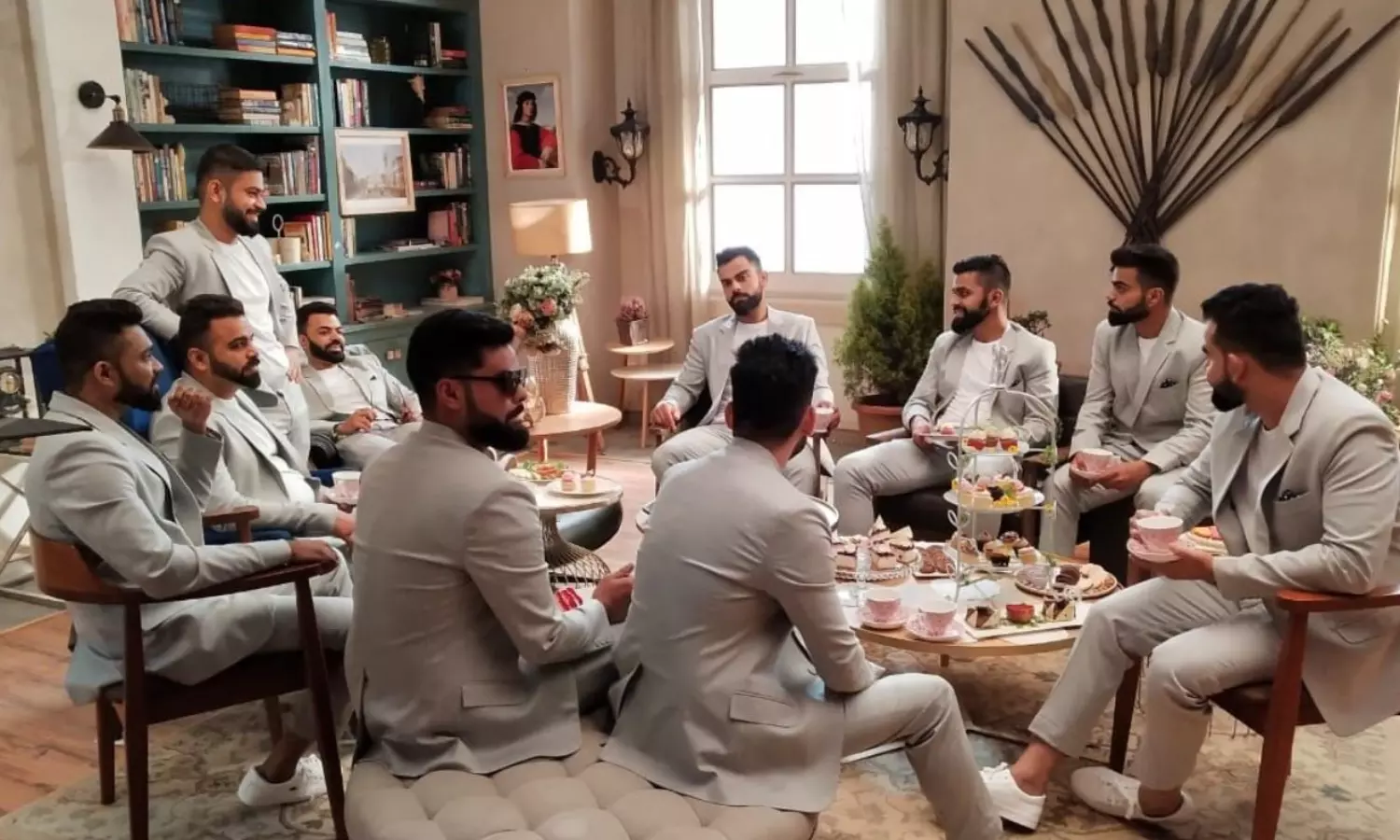 ഒരു മേശക്ക് ചുറ്റും ഒരേ വേഷത്തിലാണ് കോഹ്ലിയും ഒന്പത് പേരും ഇരിക്കുന്നത്. എല്ലാവരുടെയും യൂണിഫോം കോസ്റ്റ്യൂം തന്നെയാണ് ചിത്രത്തിലെ പ്രധാന ആകര്ഷണം. കോഹ്ലിയുടെ ട്രെന്ഡ് സെറ്ററായ താടി അപരന്മാരും അതേപോലെ നിലനിര്ത്തുന്നുണ്ട്.