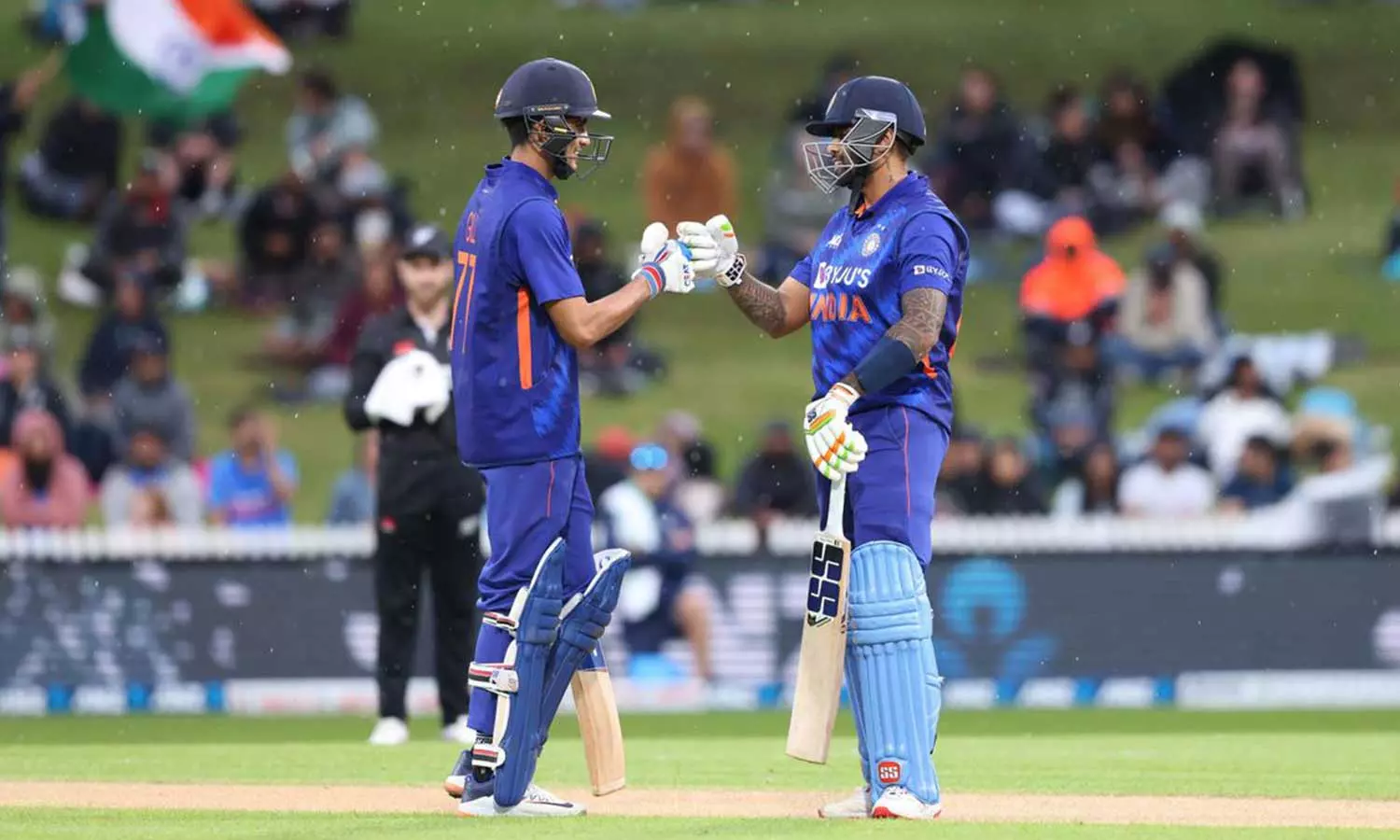 ഗിൽ സിംഗിളുകളും ബൗണ്ടറികളുമായി സ്കോർ ഏകദിനശൈലിയിൽ ഗതിവേഗം കൂട്ടിയപ്പോൾ സൂര്യ ടി20 മോഡിലായിരുന്നു. 13 ഓവറാകുമ്പോഴേക്കും തന്റെ ബൗളർമാരെ മുഴുവൻ പുറത്തിറക്കിയെങ്കിലും കിവീസ് നായകൻ വില്യംസന് ഇരുവരെയും തടയാനായില്ല. ഒടുവിൽ മഴയുടെ രൂപത്തിലാണ് കിവികൾക്ക് ആശ്വാസമെത്തിയത്. ഈ സമയത്ത് ഗിൽ 42 പന്തിൽ ഒരു സിക്സും നാല് ബൗണ്ടറിയും സഹിതം 45 റൺസാണ് സ്വന്തം പേരിലാക്കിയത്. സൂര്യയാണെങ്കിൽ 25 പന്ത് നേരിട്ട് മൂന്ന് സിക്സറും രണ്ട് ബൗണ്ടറിയും അടിച്ച് 34 റൺസാണ് സ്വന്തമാക്കിയത്.