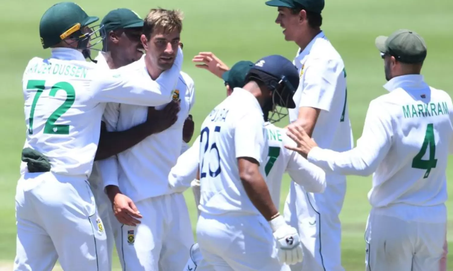 തുടർന്നെത്തിയ പുജാര അതീവ ജാഗ്രതയോടെയാണ് ബാറ്റേന്തിയത്. മോശം ഫോമിനെത്തുടർന്ന് ടീമിലെ സ്ഥാനം ഭീഷണിയിലായ താരത്തിൽനിന്ന് ഒരു തിരിച്ചുവരവ് ആരാധകർ പ്രതീക്ഷിച്ചിരുന്നു. എന്നാൽ, തൊട്ടടുത്ത പന്തുകളിൽ ഇന്ത്യയ്ക്ക് ഇരട്ട പ്രഹരം നൽകി ഡ്വുവേൻ ഒലിവിയർ. 33 പന്ത് നേരിട്ട് മൂന്നു റൺസെടുത്തുനിന്ന പുജാരയെയാണ് ഒലിവിയർ ആദ്യം പിടികൂടിയത്. ഷോർട്ട് ലെങ്ത് പന്ത് പ്രതിരോധിക്കാനുള്ള പുജാരയുടെ ശ്രമം തെംബ ബാവുമയുടെ കൈയിൽ അവസാനിച്ചു. തൊട്ടടുത്ത പന്തിൽ മോശം പ്രകടനം തുടരുന്ന രഹാനെ ഗോൾഡൻ ഡക്ക്! ഒലിവിയറുടെ ഷോർട്ട് ലെങ്ത് പന്തിൽ തന്നെയായിരുന്നു രഹാനെയുടെയും മടക്കം. താരത്തെ കീഗൻ പീറ്റേഴ്സന്റെ കൈയിലെത്തിച്ച ഒലിവിയർക്ക് 50-ാം വിക്കറ്റ് നേട്ടം.