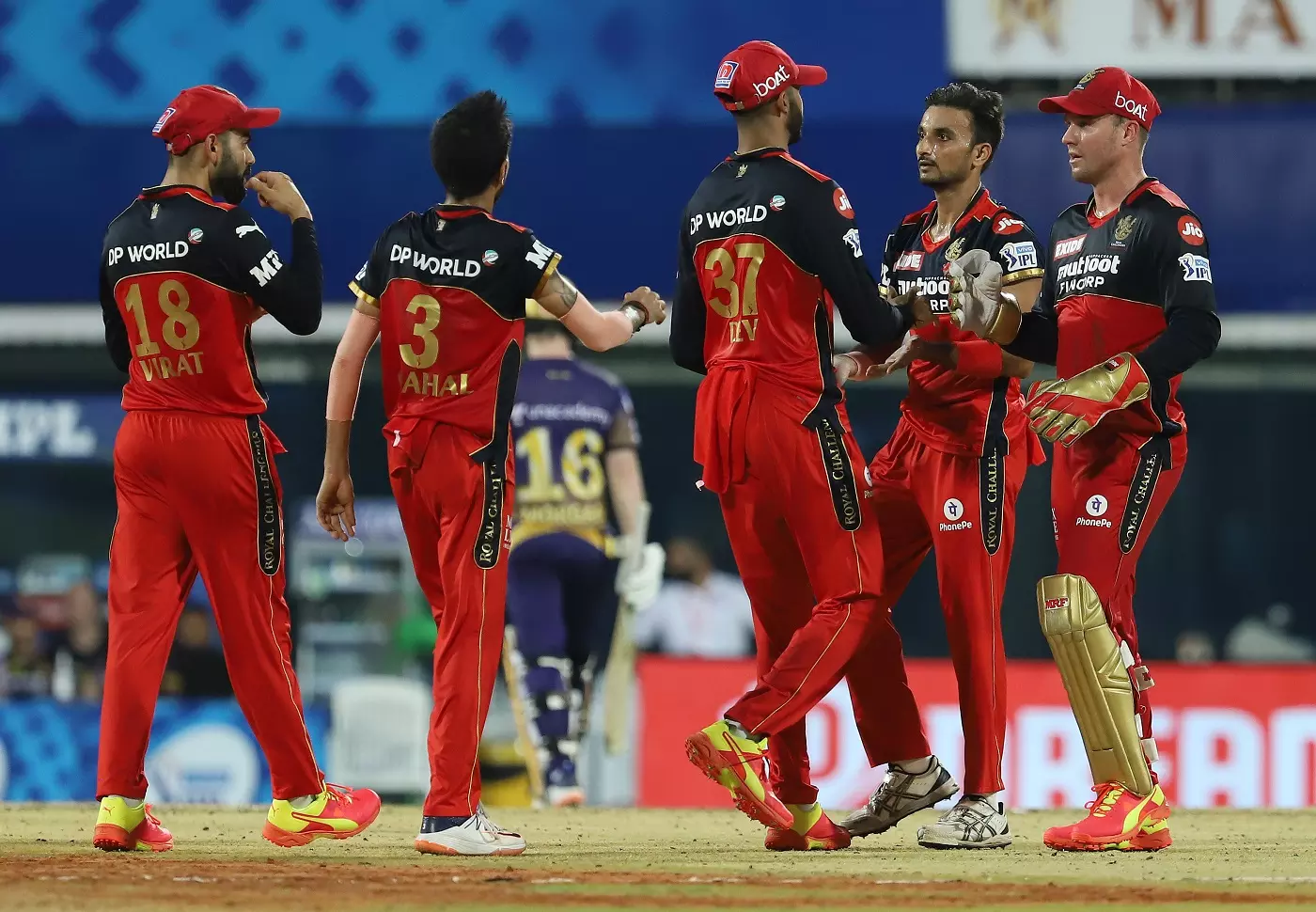സ്കോർബോർഡിൽ രണ്ടക്കം കാണുന്നതിന് മുമ്പ് രണ്ട് വിക്കറ്റ് വീണ് തകർച്ചയോടെയായിരുന്നു ബാംഗ്ലൂരിൻറെ തുടക്കം. മത്സരത്തിൻറെ രണ്ടാം ഓവറിൽ തന്നെ ക്യാപ്റ്റൻ വിരാട് കോഹ്ലിയെ ടീമിന് നഷ്ടമായി. വരുൺ ചക്രമർത്തിയുടെ പന്തിൽ അസാധ്യ അംഗിളിൽ നിന്ന് മനോഹരമായി ക്യാച്ചിലൂടെ രാഹുൽ ത്രിപാഠിയാണ് ബാംഗ്ലൂരിൻറെ നായകനെ പുറത്താക്കിയത്. ആറ് പന്തിൽ ഒരു ബൌണ്ടറിയുൾപ്പടെ അഞ്ച് റൺസെടുത്ത് നിൽക്കവേയാണ് വിരാടിനെ അപ്രതീക്ഷിത ക്യാച്ചിലൂടെ ത്രിപാഠി മടക്കുന്നത്. പിന്നീടെത്തിയ പട്ടേദാറിനും നിലയുറപ്പിക്കാനായില്ല. അക്കൌണ്ടിൽ ഒരു റൺസ് ചേർക്കുമ്പോഴേക്കും വരുൺ ചക്രവർത്തിയുടെ പന്തിൽ പട്ടേദാർ ബൌൾഡായി.