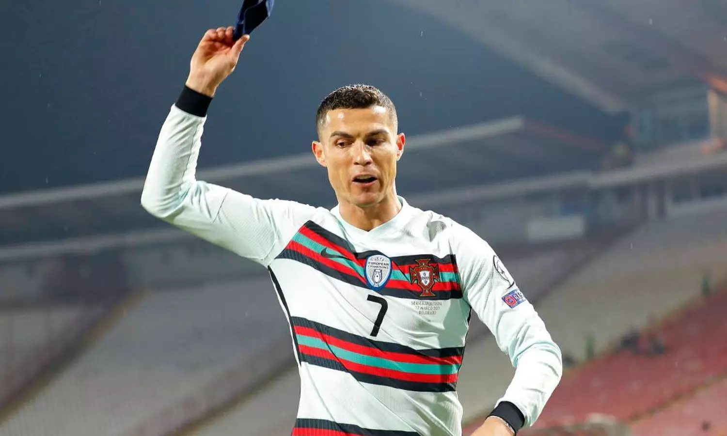 സെര്ബിയക്കെതിരായ മത്സരത്തിലാണ് അവസാന നിമിഷം നേടിയ വിജയഗോൾ അനുവദിക്കാത്തതിനെ തുടര്ന്ന് റൊണാള്ഡോ ആംബാന്ഡ് ഊരിയെറിഞ്ഞത്. തന്റെ ഷോട്ട് ഗോൾലൈൻ കടന്നിട്ടും അനുവദിക്കാതിരുന്ന റഫറിയുടെ തീരുമാനത്തിൽ പരസ്യമായി പ്രതിഷേധിച്ച റൊണാൾഡോ, ക്യാപ്റ്റന്റെ ആംബാൻഡ് ഊരിയെറിഞ്ഞ് ഫൈനൽ വിസിൽ മുഴങ്ങും മുൻപേ ഗ്രൗണ്ട് വിടുകയും ചെയ്തു. ഗോളിനായി വാദിച്ച് പ്രതിഷേധിച്ച റൊണാൾഡോക്ക് റഫറി മഞ്ഞക്കാർഡും നൽകി. ഈ ഗോൾ അനുവദിക്കാതിരുന്നതോടെ പോർച്ചുഗലും സെർബിയയും 2–2 സമനിലയിൽ പിരിയുകയായിരുന്നു.