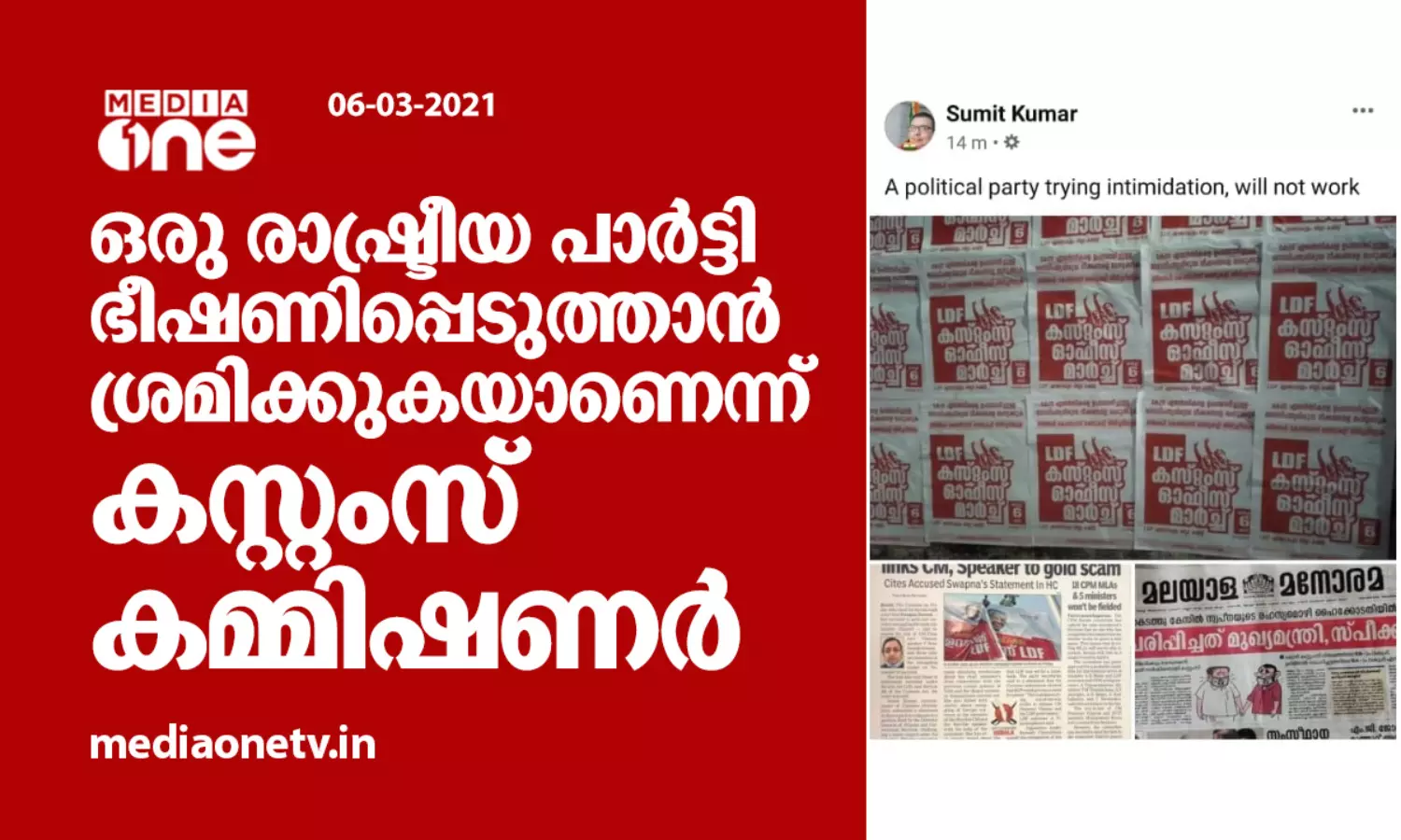 എല്.ഡി.എഫ് മാര്ച്ചിന്റെ പോസ്റ്ററുകള് ഉള്പ്പെടുത്തിക്കൊണ്ടാണ്, ഒരു രാഷ്ട്രീയ പാര്ട്ടിയുടെയും പേരു പരാമര്ശിക്കാതെ കസ്റ്റംസ് കമ്മിഷണറുടെ ഫേസ്ബുക്ക് പോസ്റ്റ്