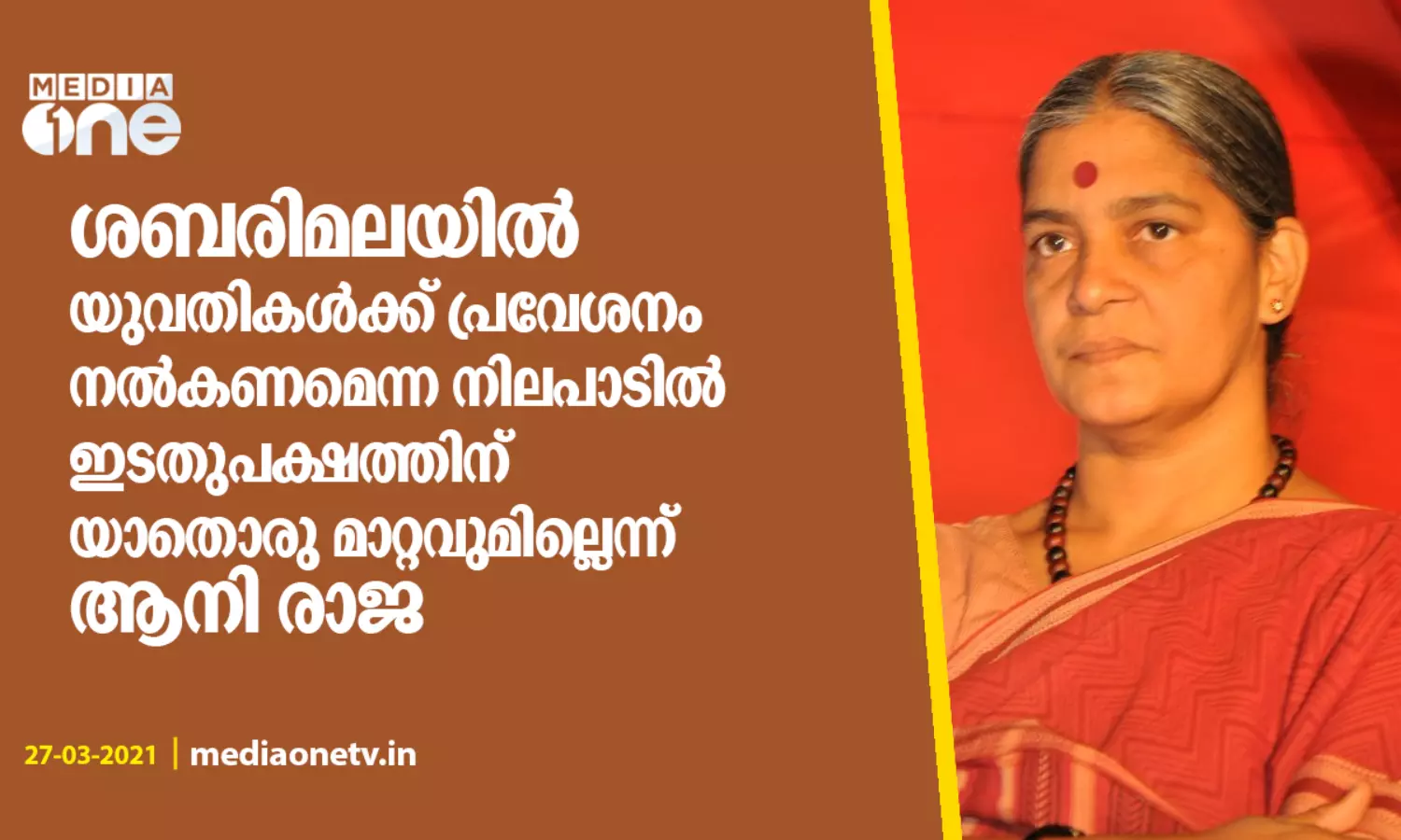 ശബരിമലയിൽ യുവതികൾക്ക് പ്രവേശനം നൽകണമെന്ന നിലപാടിൽ ഇടതുപക്ഷത്തിന് യാതൊരു മാറ്റവുമില്ലെന്ന് സി.പി.ഐ നേതാവ് ആനി രാജ.