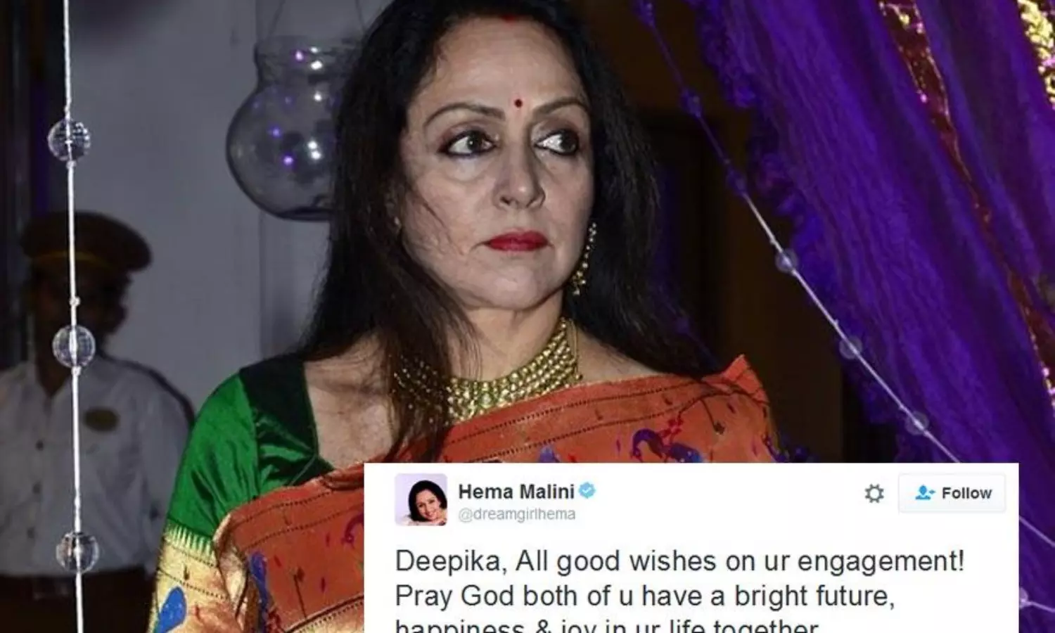"ദീപിക, വിവാഹ നിശ്ചയത്തിന് എല്ലാ ആശംസകളും. രണ്ട് പേരുടെയും ഭാവി ശോഭനമാക്കാനും ജീവിതത്തില് സന്തോഷം നിറയ്ക്കാനും ദൈവത്തോട് പ്രാര്ഥിക്കുന്നു"- ഇന്ന് ട്വിറ്ററില് ഏറ്റവും അധികം ചര്ച്ച ചെയ്യപ്പെട്ടത് ഹേമമാലിനിയുടെ ഈ ട്വീറ്റാണ്.