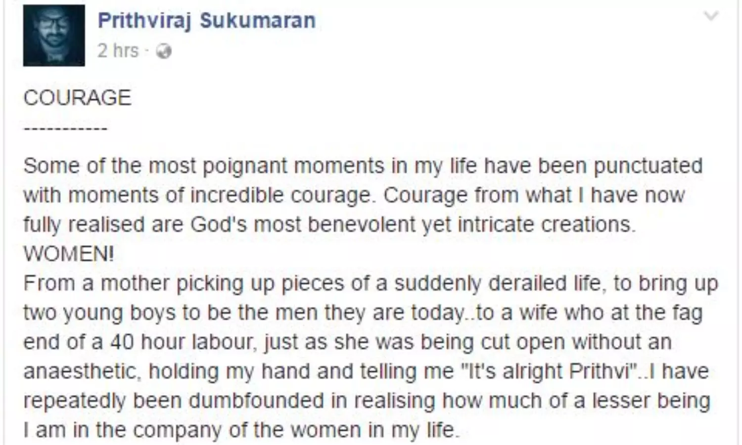 തന്റെ സുഹൃത്തായ നടി കാണിച്ചത് അസാമാന്യമായ ധൈര്യമെന്നും ഫേസ്ബുക്കില് പൃഥ്വിരാജ്.