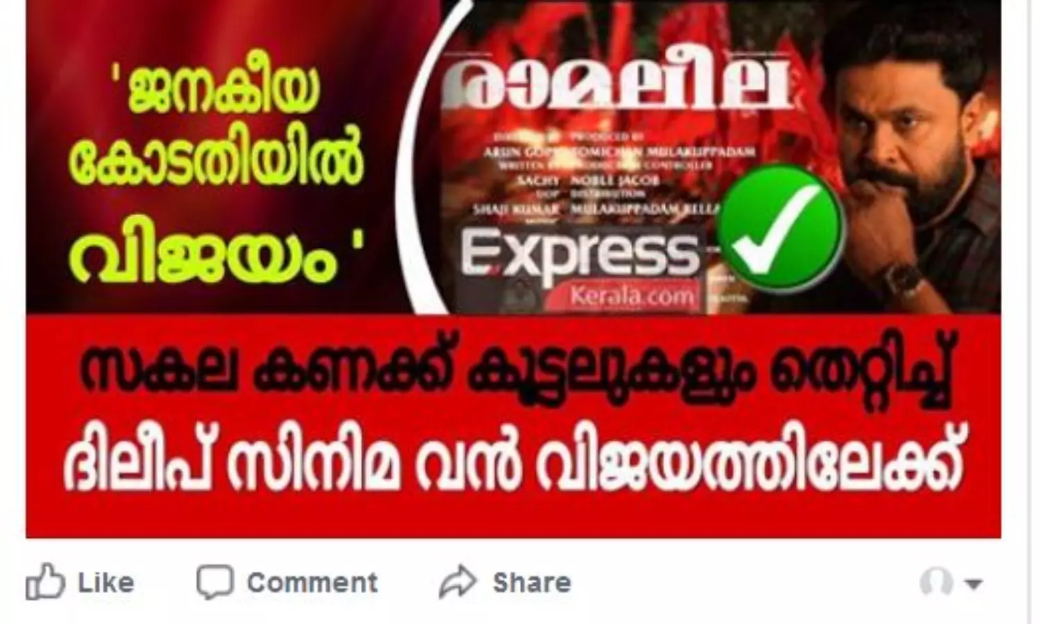സകല കണക്കുകൂട്ടലുകളും തെറ്റിച്ച് ദിലീപ് സിനിമ വന്വിജയത്തിലേക്കെന്ന് സംവിധായകന് ലാല് ജോസ്. ജനകീയ കോടതിയില് ദിലീപിന് വിജയമെന്ന തലക്കെട്ടില് ഒരു വെബ്സൈറ്റ് ഫേസ് ബുക്കില് ഷെയര് ചെയ്ത പോസ്റ്ററാണ് ലാല് ജോസ് തന്റെ പേജിലിട്ടത്. പോസ്റ്റിന് താഴെ നിരവധി പേരാണ് പ്രതിഷേധവുമായെത്തിയത്.