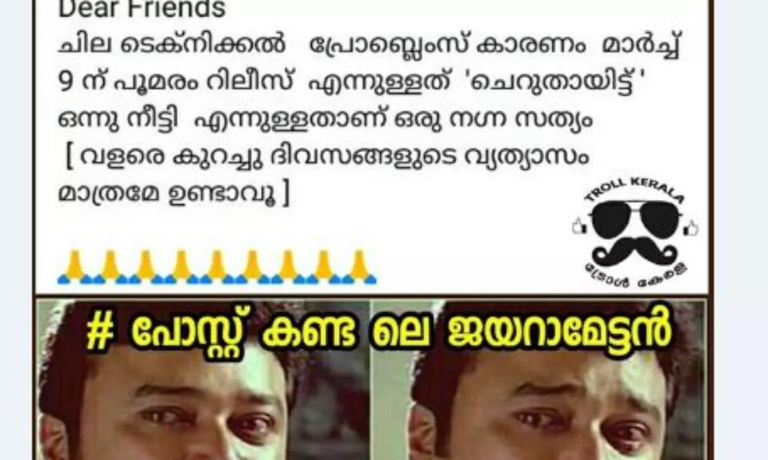 ചില ടെക്നിക്കല് പ്രോബ്ലെംസ് കാരണം മാര്ച്ച് 9 ന് പൂമരം റിലീസ് എന്നുള്ളത് 'ചെറുതായിട്ട് ' ഒന്നു നീട്ടി എന്നുള്ളതാണ് ഒരു നഗ്ന സത്യം.