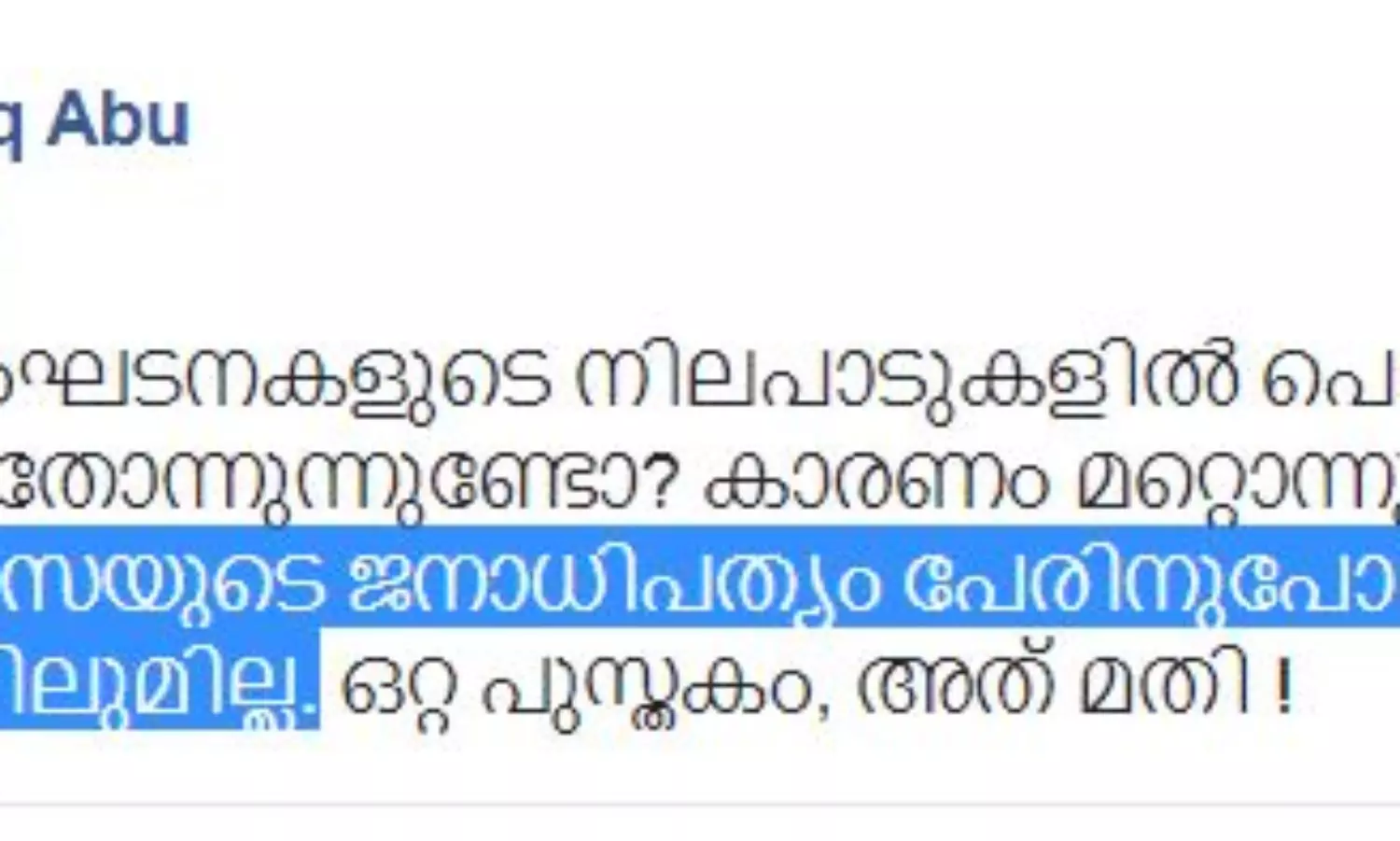 "അഞ്ചുപൈസയുടെ ജനാധിപത്യം പേരിനുപോലും ഇതിലൊന്നിലുമില്ല..."