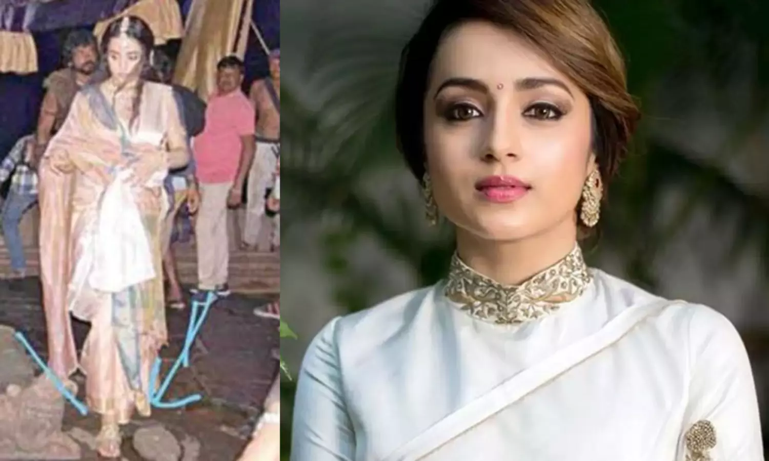 ചിത്രീകരണത്തിന്റെ ഇടവേളയില് ക്ഷേത്രം സന്ദര്ശിച്ച തൃഷയുടെ ചിത്രങ്ങള് സമീപത്തുള്ളവര് പകര്ത്തുകയായിരുന്നു. ഇത് പിന്നീട് സോഷ്യല് മീഡിയയില് വൈറലായി. ഈ ചിത്രങ്ങളിലാണ് തൃഷ ചെരുപ്പ് ധരിച്ച് ക്ഷേത്രത്തിനകത്തെ ശിവലിംഗ വിഗ്രഹത്തിനും നന്തി വിഗ്രഹത്തിനും സമീപം നില്ക്കുന്നത്. ക്ഷേത്രത്തിനകത്ത് ചെരുപ്പ് ധരിച്ച തൃഷയുടെ നടപടി തെറ്റാണെന്നും നടിയെ അറസ്റ്റ് ചെയ്യണമെന്നും ആവശ്യപ്പെട്ട് തമിഴ്നാട്ടിലെ ഹിന്ദു സംഘടനകള് രംഗത്തുവന്നതായി ന്യൂസ് 18 കന്നഡ, സാക്ഷി ചാനലുകള് റിപ്പോര്ട്ട് ചെയ്യുന്നു.
