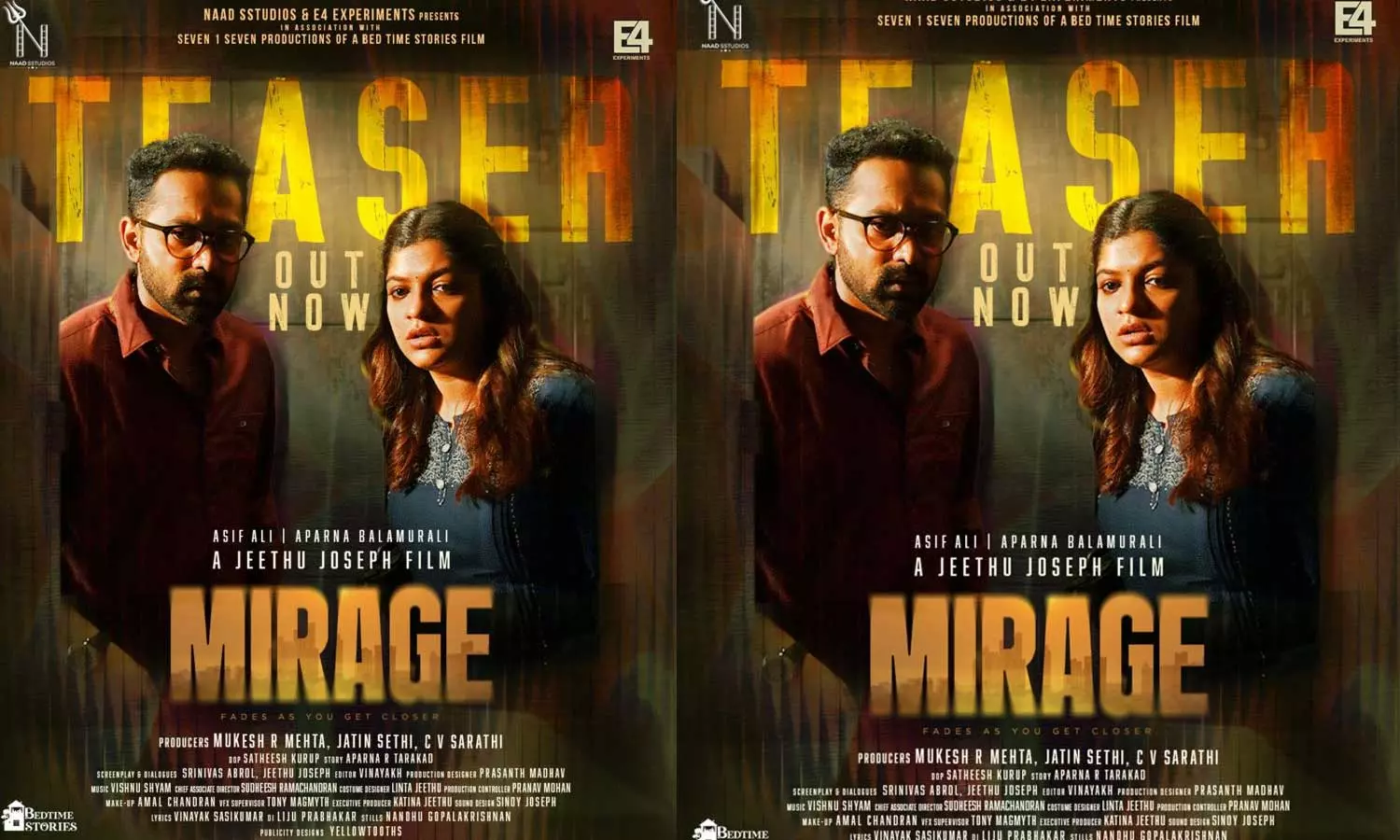 മികച്ച പ്രേക്ഷക-നിരൂപക പ്രശംസ നേടിയ 'കിഷ്കിന്ധാ കാണ്ഡ'ത്തിന് ശേഷം ആസിഫ് അലിയും അപർണ ബാലമുരളിയും വീണ്ടും ഒന്നിക്കുന്ന ജീത്തു ജോസഫ് ചിത്രം 'മിറാഷ്' എന്ന സിനിമയുടെ ആകാംക്ഷ നിറയ്ക്കുന്ന ടീസർ പുറത്തിറങ്ങി. ഇമോഷണൽ രംഗങ്ങളിലൂടേയും ത്രില്ലടിപ്പിക്കുന്ന നിമിഷങ്ങളിലൂടേയും നീങ്ങുന്ന ചിത്രമെന്ന് അടിവരയിടുന്നതാണ് ടീസര്.