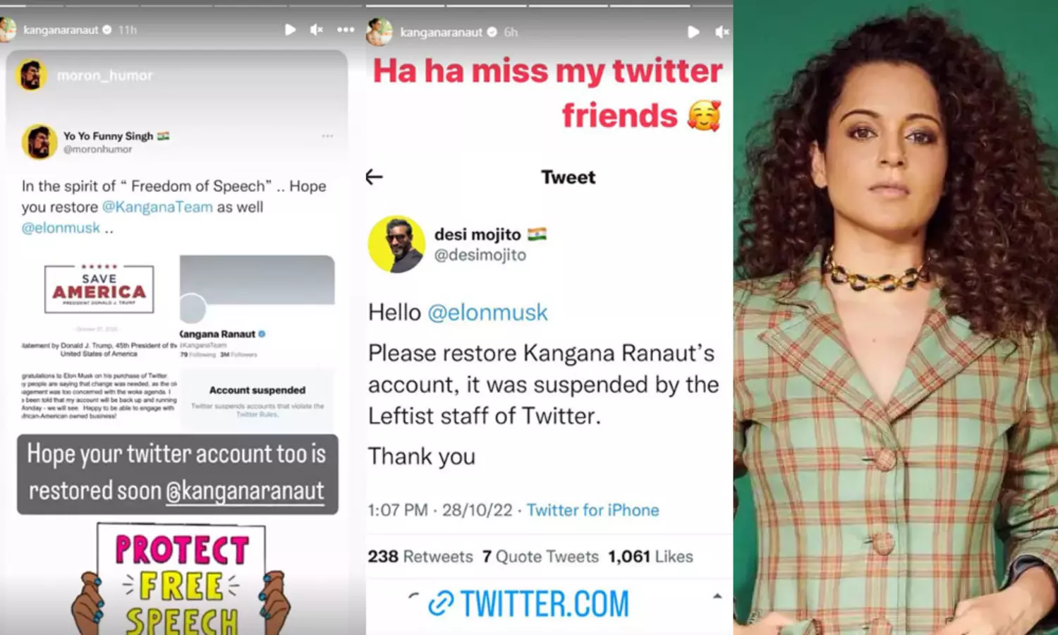 'അഭിപ്രായ സ്വാതന്ത്ര്യം സംരക്ഷിക്കണം', എന്ന സ്റ്റിക്കര് കമന്റും കങ്കണ ഇന്സ്റ്റാഗ്രാം പോസ്റ്റില് ചേര്ത്തിട്ടുണ്ട്. ട്വിറ്ററിലെ സുഹൃത്തുക്കളെ 'മിസ്' ചെയ്യുന്നതായും കങ്കണ കുറിച്ചു. ട്വിറ്റർ വാങ്ങിയതിനു പിന്നാലെ മുതിർന്ന ഉദ്യോഗസ്ഥരെ പിരിച്ചുവിട്ട ഇലോൺ മസ്കിന്റെ വാര്ത്ത പങ്കുവെച്ച് അതിന് 'കൈയ്യടിക്കുന്ന' സ്മൈലി ചേര്ത്ത് ഇന്സ്റ്റാഗ്രാം പോസ്റ്റും കങ്കണ പങ്കുവെച്ചിട്ടുണ്ട്. തുടര്ച്ചയായി നിയമ ലംഘനങ്ങള് ചൂണ്ടിക്കാട്ടി കഴിഞ്ഞ വര്ഷം മെയിലാണ് കങ്കണയുടെ അക്കൗണ്ട് ട്വിറ്റര് അധികൃതര് സസ്പെന്ഡ് ചെയ്തത്.