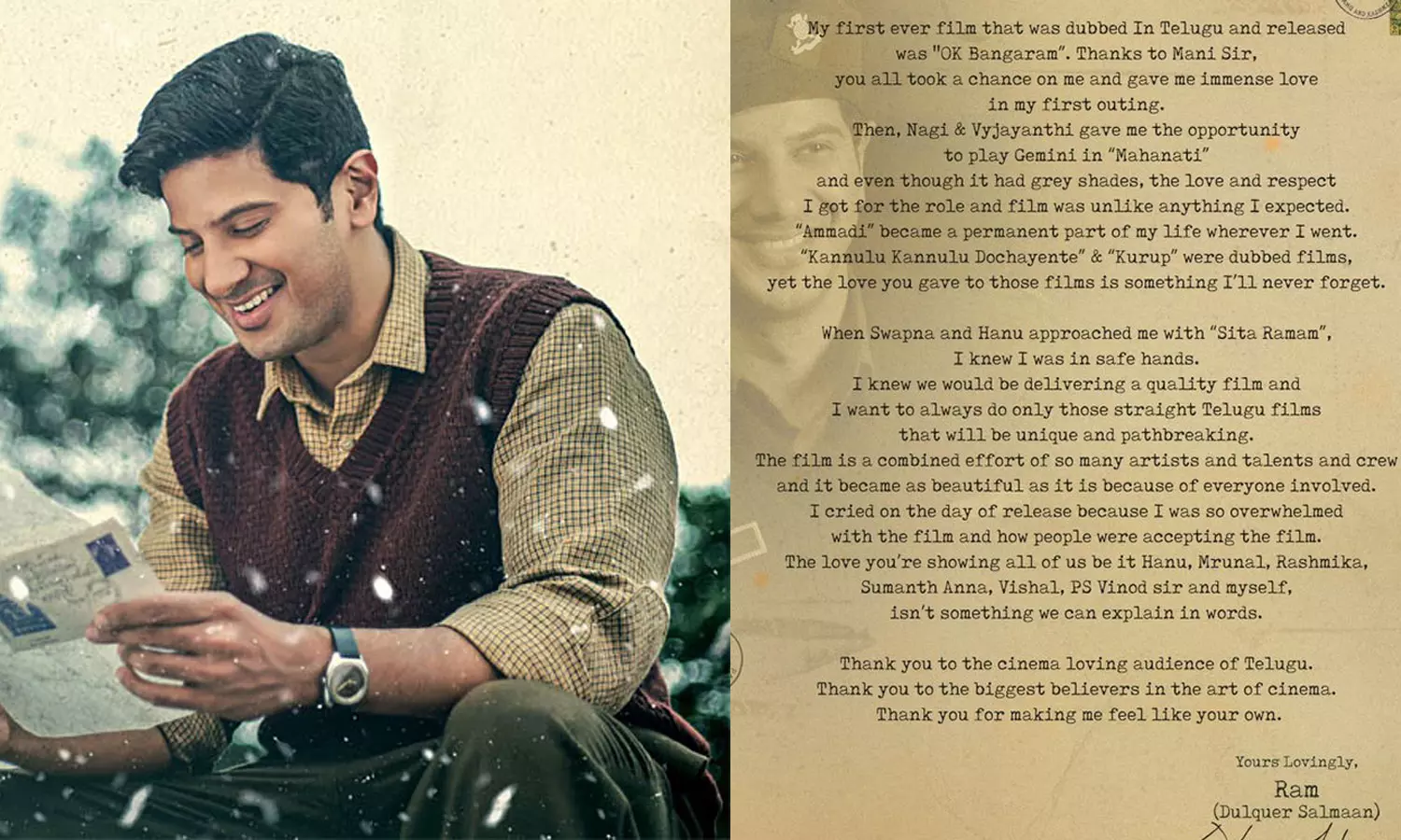 നിരവധി പ്രതിഭകളുടെ പ്രയത്നമാണ് 'സീതാരാമം' എന്നും അതിന്റെ പിന്നണിയിൽ പ്രവർത്തിച്ച ഓരോരുത്തരുമാണ് സിനിമയെ മനോഹരമാക്കിയതെന്നും ദുൽഖർ കുറിച്ചു. തന്നെ ഏറ്റെടുത്ത തെലുങ്ക് സിനിമാ പ്രേമികള്ക്ക് നന്ദി അറിയിച്ചാണ് താരത്തിന്റെ വൈകാരികമായ കുറിപ്പ് അവസാനിക്കുന്നത്.