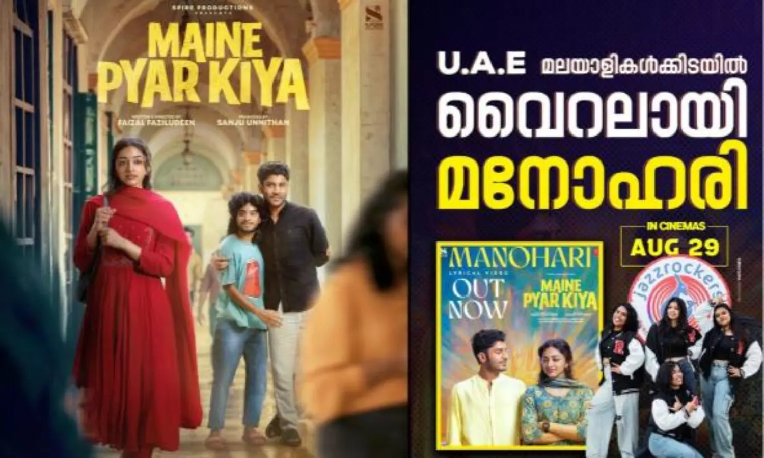ഓണം റിലീസുകൾക്കിടയിൽ പ്രേക്ഷകർ ഏറെ പ്രതീക്ഷയോടെ കാത്തിരിക്കുന്ന ചിത്രമാണ് മേനേ പ്യാർ കിയ. ചിത്രത്തിലെ മനോഹരി എന്ന ഗാനം ഏറെ ശ്രദ്ധ നേടിയിരുന്നു. ഇപ്പോഴിതാ മനോഹരി അന്തർദേശീയ തലത്തിൽ ശ്രദ്ധ നേടിയിരിക്കുകയാണ്. യുഎഇയിൽ ജാസ്റോക്കേഴ്സ് (jazzrockers) എന്ന പ്രമുഖ വിദ്യാഭ്യാസ സ്ഥാപനത്തിലെ കുട്ടികൾ മേനേ പ്യാർ കിയായിലെ മനോഹരി ഗാനത്തിന് ചുവടു വെച്ച് അവരുടെ സോഷ്യൽ മീഡിയ പേജിൽ പങ്കുവെച്ചിരിക്കുകയാണ്.