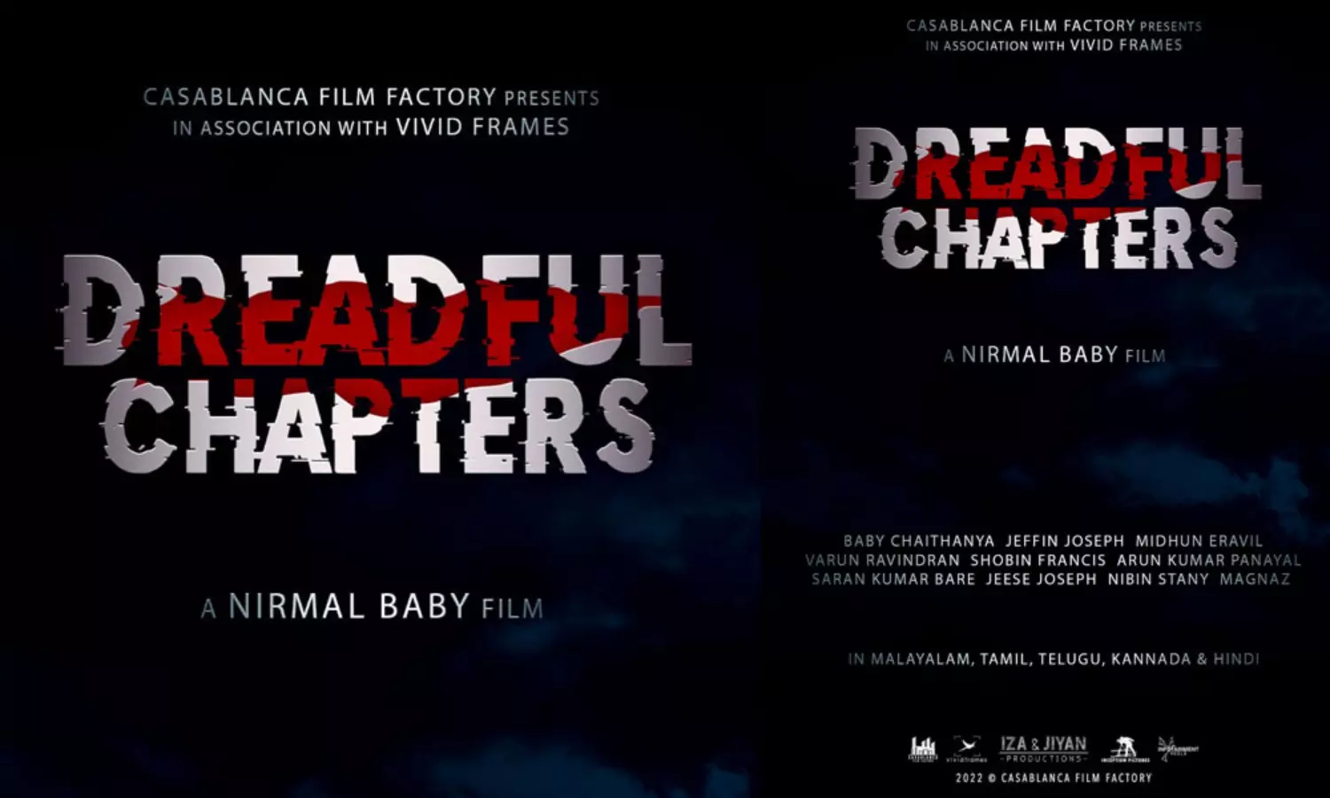 തരിയോട്, വഴിയെ എന്നീ ചിത്രങ്ങൾക്ക് ശേഷം കാസാബ്ലാങ്കാ ഫിലിം ഫാക്ടറിയുടെ ബാനറിൽ നിർമൽ ബേബി വർഗീസ് സംവിധാനം ചെയ്യുന്ന പുതിയ ചിത്രമായ 'ഡ്രെഡ്ഫുൾ ചാപ്റ്റേഴ്സിന്റെ' ടൈറ്റിൽ പോസ്റ്റർ പുറത്തിറക്കി. വിവിഡ് ഫ്രെയിംസുമായി സഹകരിച്ച് നിർമൽ ബേബി, ബേബി ചൈതന്യ എന്നിവർ ചേർന്ന് നിർമ്മിക്കുന്ന ഹൊറർ ത്രില്ലർ ചിത്രം മലയാളത്തിന് പുറമെ തമിഴ്, തെലുഗ്, കന്നഡ, ഹിന്ദി എന്നീ ഭാഷകളിലും പുറത്തിറങ്ങും.