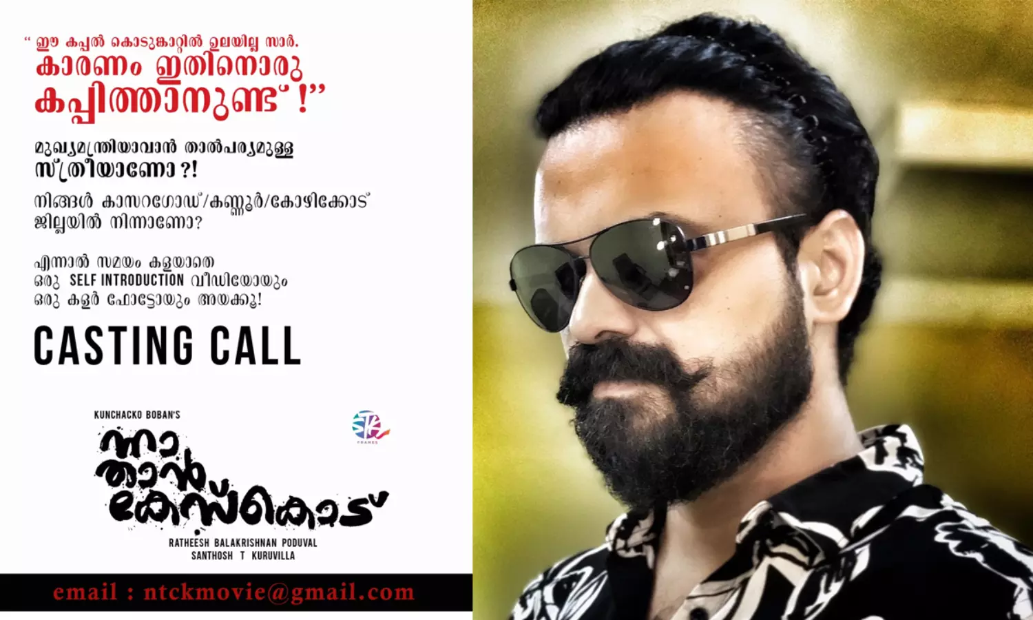 കുഞ്ചാക്കോ ബോബൻ നായകനാകുന്ന ' ന്നാ താൻ കേസ്കൊട് ' എന്ന ചിത്രത്തിലേക്ക് മുഖ്യമന്ത്രിയകാൻ താൽപര്യമുള്ള സ്ത്രീകളെ ക്ഷണിച്ചുകൊണ്ടുള്ള കാസ്റ്റിംഗ് കോൾ വൈറലാവുകയാണ്. " ഈ കപ്പൽ കൊടുങ്കാറ്റിൽ ഉലയില്ല സാർ.കാരണം ഇതിനൊരു കപ്പിത്താനുണ്ട്. മുഖ്യമന്ത്രിയാകാൻ താൽപര്യമുള്ള സ്ത്രീയാണോ നിങ്ങൾ " എന്നാണ് കാസ്റ്റിംഗ് കോളിൻ്റെ ഉള്ളടക്കം.