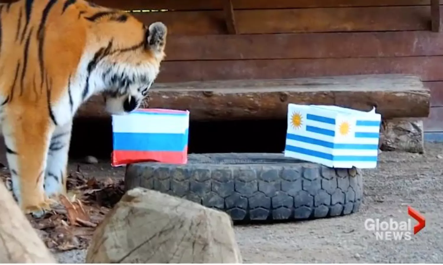 റൊയേവ് റുച്ചേയ് മൃഗശാലയിലെ സൈബീരിയന് കടുവയാണ് ഇന്നത്തെ മത്സരത്തില് റഷ്യ ജയിക്കുമെന്ന് പറയുന്നത്. റഷ്യയുടെയും ഉറുഗ്വേയുടെയും പതാകയടങ്ങിയ ഓരോ പെട്ടികള് ഒരിടത്ത് വെച്ചിരിക്കുന്നു. ആദ്യം വന്ന് ഇരുപെട്ടികളും നോക്കിയ ശേഷം പുള്ളിക്കാരന് തിരിച്ചുപോയി. എന്നാല് വീണ്ടും വന്ന് റഷ്യന് പതാകയടങ്ങിയ പെട്ടി തെരഞ്ഞെടുക്കുകയായിരുന്നു. മൃഗശാലയിലെത്തിയ നിരവധി പേര് ഈ പ്രവചനം വീക്ഷിക്കുന്നുണ്ടായിരുന്നു. ആതിഥേയരായ റഷ്യയെ സംബന്ധിച്ച് പ്രതീക്ഷ നല്കുന്നതാണിത്.
