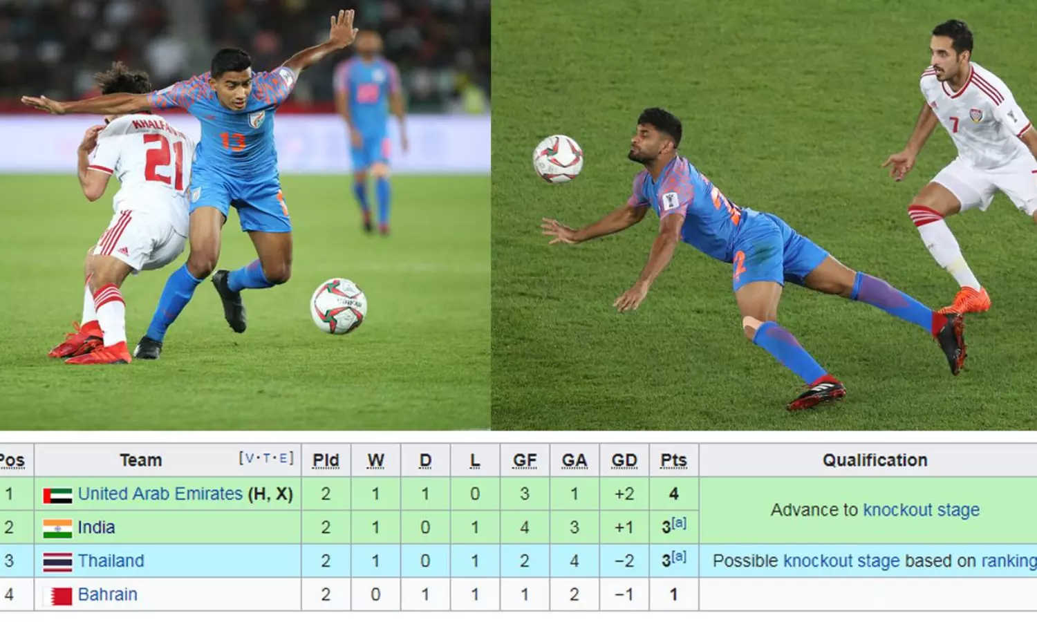 ഗ്രൂപ്പില് രണ്ട് മത്സരങ്ങളില് നിന്നും ഒരു ജയവും സമനിലയുമായി നാല് പോയിന്റുള്ള യു.എ.ഇക്ക് തന്നെയാണ് മുന്തൂക്കം. ഇന്ത്യക്കും തായ്ലണ്ടിനും മൂന്ന് പോയിന്റ് വീതമുണ്ട്. എന്നാല് ഗോള് ശരാശരിയില് ഇന്ത്യക്കാണ് മുന്തൂക്കം. ഇന്ത്യ നാല് ഗോള് അടിക്കുകയും മൂന്ന് ഗോള് വഴങ്ങുകയും ചെയ്തപ്പോള് തായ്ലണ്ട് രണ്ട് ഗോള് അടിക്കുകയും നാല് ഗോള് വഴങ്ങുകയും ചെയ്തു. ബഹ്റെയ്നെതിരായ മത്സരം ജയിച്ചാല് മറ്റു മത്സരഫലങ്ങളെ ആശ്രയിക്കാതെ ഇന്ത്യക്ക് പ്രീ ക്വാര്ട്ടറിലെത്താം.