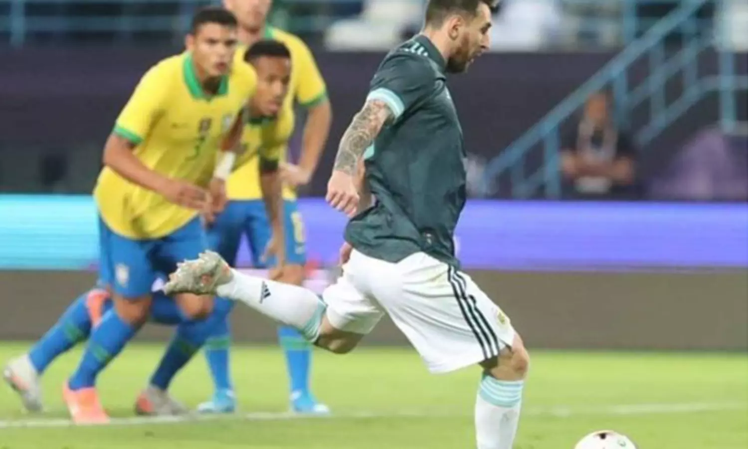 തൊട്ടുപിന്നാലെ 13-ാം മിനുട്ടിൽ അർജന്റീനക്കും പെനാൽട്ടി കിട്ടി. പന്തുമായി മുന്നേറിയ മെസ്സിയെ ബ്രസീൽ ഡിഫന്റർ ബോക്സിൽ വീഴ്ത്തിയതിനാണ് ന്യൂസിലാന്റുകാരനായ മാത്യു കോങ്ഗർ സ്പോട്ടിലേക്ക് വിരൽചൂണ്ടിയത്. കോപ അമേരിക്ക ഫൈനലിൽ ഷൂട്ടൗട്ട് കിക്ക് നഷ്ടപ്പെടുത്തിയ മെസ്സി, കിക്കെടുക്കാൻ വരുമ്പോൾ ബ്രസീൽ ആരാധകരുടെ മനസ്സിലും അർജന്റീനാ ഫാൻസിന്റെ മനസ്സിലും ഒരേ ആധിയായിരുന്നു.