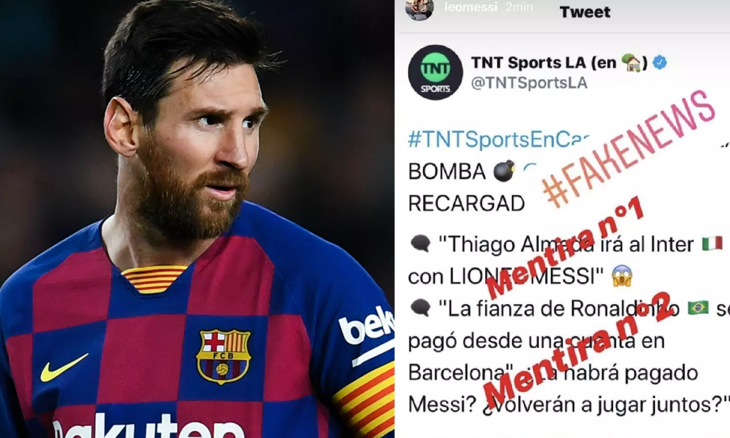 ബാഴ്സലോണയില് നിന്നും മെസി പുറത്തുപോവുകയാണെന്ന വാര്ത്തകളും ശക്തമായിരുന്നു. ഇറ്റാലിയന് ക്ലബായ ഇന്ററിലേക്ക് മെസി പോകുന്നുവെന്നായിരുന്നു ടി.എന്.ടി സ്പോര്ട്സ് തന്നെയായിരുന്നു ഈ വാര്ത്തയും പുറത്തുവിട്ടത്. മെസിയുമായുള്ള കരാര് അസംഭവ്യമല്ലെന്ന മുന് ഇന്റര് പ്രസിഡന്റ് മാസിമോ മൊറാട്ടിയുടെ വാക്കുകളും ഈ പ്രചാരണത്തിന് കരുത്തേകി.