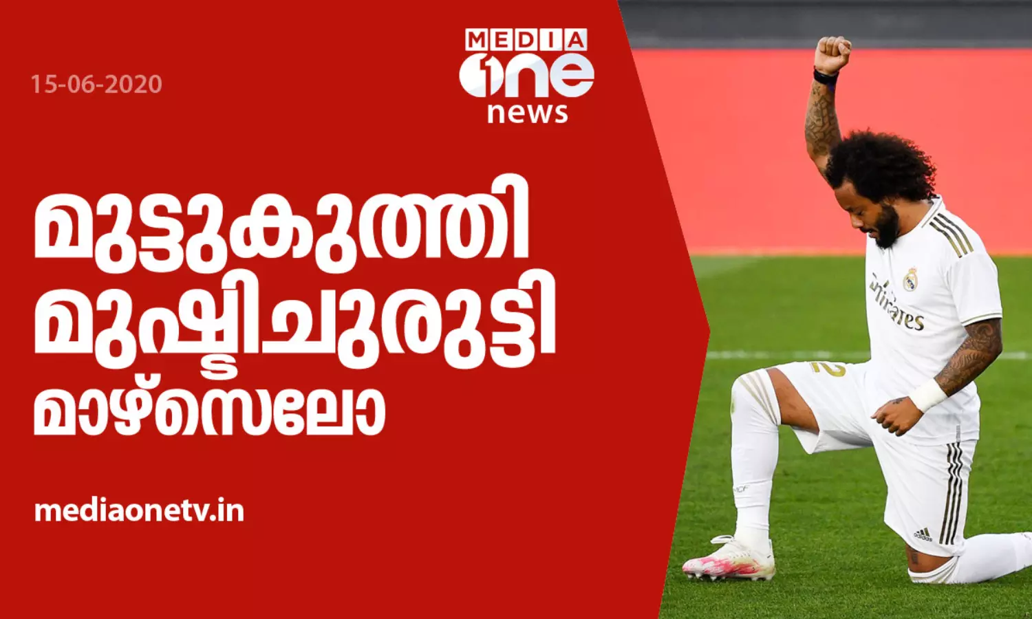'ബ്ലാക്ക് ലൈവ്സ് മാറ്റര്' മുന്നേറ്റത്തിന് പിന്തുണയുമായി റയല്മാഡ്രിഡ് താരം മാഴ്സെലോ. ലാലിഗയില് എയ്ബറിനെതിരായ മത്സരത്തില് മൂന്നാം ഗോള് നേടിയ ശേഷമാണ് ബ്രസീലിയന് താരം മുട്ടുകുത്തിയിരുന്ന് വംശീയ വിദ്വേഷത്തിനെതിരായ പോരാട്ടങ്ങള്ക്ക് പിന്തുണ പ്രഖ്യാപിച്ചത്. കോവിഡ് ഇടവേളക്കു ശേഷം കളിക്കാനിറങ്ങിയ റയല്മാഡ്രിഡ് 3-1ന് എയ്ബറിനെ തോല്പിച്ചു.