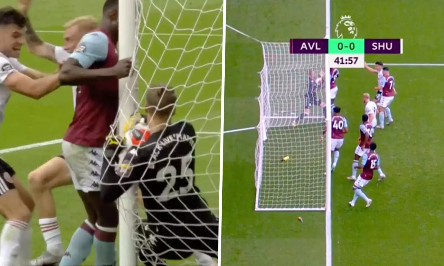 മത്സരത്തിലെ 42ാം മിനുറ്റിലായിരുന്നു നാടകീയ സംഭവങ്ങള്. ഷെഫീല്ഡ് യുണൈറ്റഡിന്റെ ഒലിവര് നോര്വുഡിന്റെ ഫ്രീകിക്കിനൊപ്പം ഗോളിയും പന്തും ഗോള് വര കടന്ന് ഉള്ളിലെത്തി. വില്ലയുടെ ഗോളി അപ്പോഴും തഞ്ചത്തിനൊപ്പിച്ച് പന്ത് പുറത്തേക്ക് പിടിച്ചതോടെ സംശയമായി. ഗോളിനു വേണ്ടി വാദിച്ച് ഷെഫീല്ഡ് താരങ്ങള് റഫറിയെ സമീപിച്ചു. ഗോള് വര കടന്നുവെന്ന ഗോള് ലൈന് സാങ്കേതികവിദ്യയുടെ സൂചന ലഭിക്കാതിരുന്നതോടെ റഫറി ഗോള് അനുവദിച്ചില്ല.