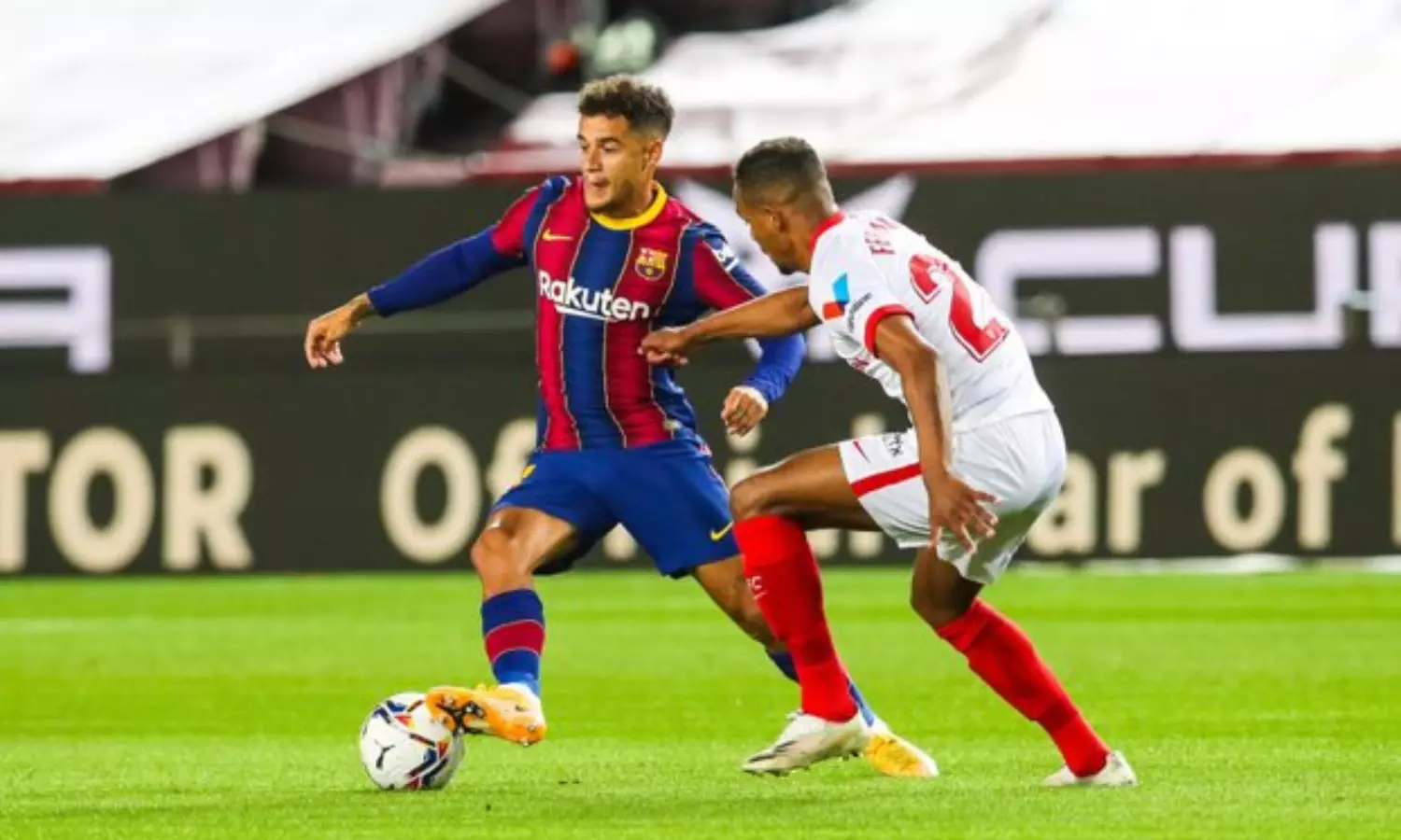 എട്ടാം മിനുട്ടിൽ ബാഴ്സ ബോക്സിലുണ്ടായ കൂട്ടപ്പൊരിച്ചിലിൽ ലൂക്ക് ഡിയോങ് ആണ് സന്ദർശകരെ മുന്നിലെത്തിച്ചത്. രണ്ട് മിനുട്ടിനുള്ളിൽ ബാഴ്സ ഗോൾ മടക്കുകയും ചെയ്തു. മെസ്സി ബോക്സിലേക്ക് ഉയർത്തിനൽകിയ പന്ത് ക്ലിയർ ചെയ്യുന്നതിൽ സെവിയ്യ ഡിഫന്റർക്ക് പിഴച്ചപ്പോൾ പന്ത് കാൽക്കലാക്കിയ ഫിലിപ്പ് കുട്ടിന്യോ അനായാസം ഫിനിഷ് ചെയ്തു. ബയേണിൽ നിന്ന് തിരിച്ചെത്തിയ ശേഷമുള്ള കുട്ടിന്യോയുടെ ആദ്യ ലാലിഗ ഗോളായിരുന്നു ഇത്.