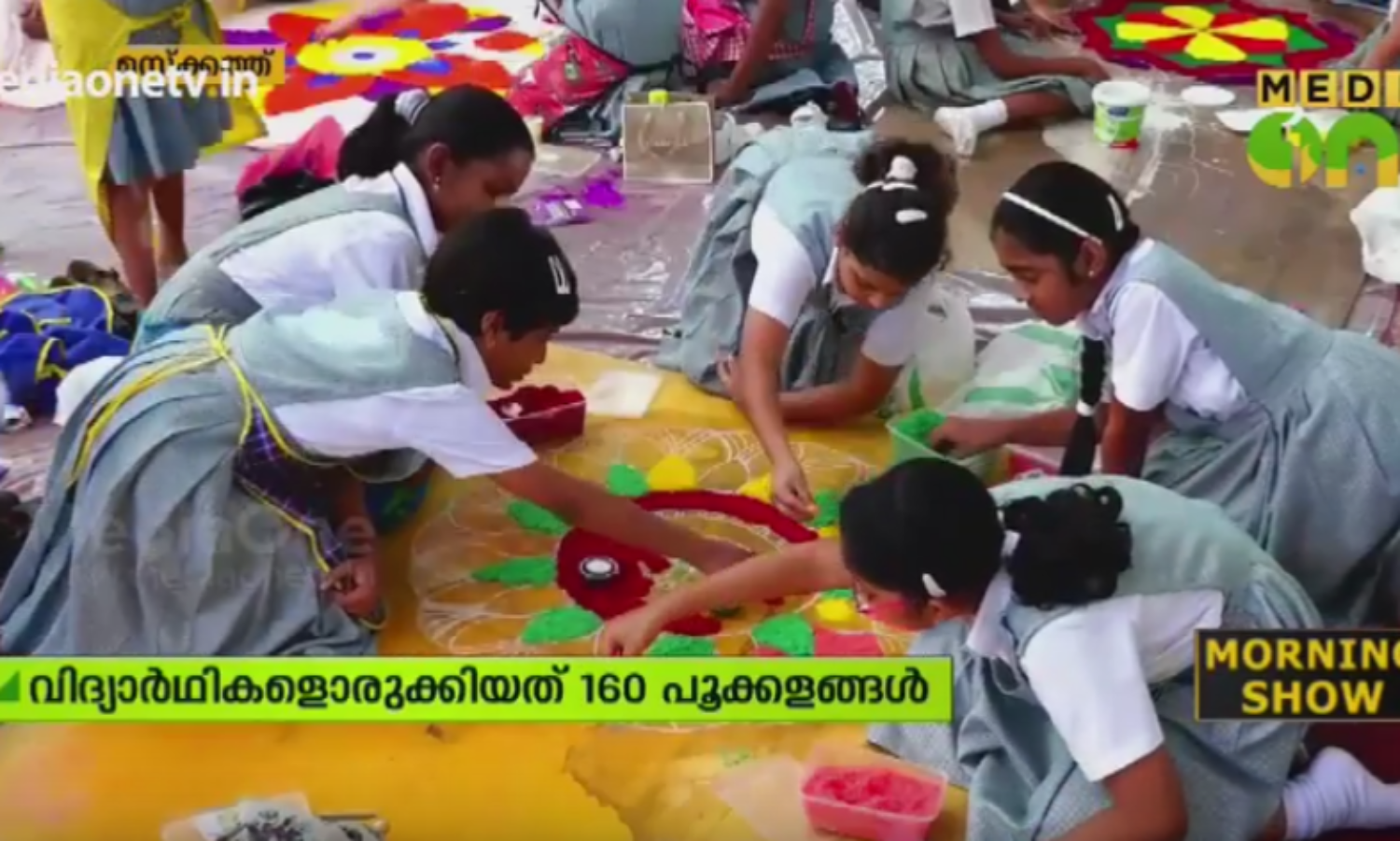 സ്കൂള് മൈതാനത്ത് നടന്ന മല്സരത്തില് കുട്ടികളുടെ കൂട്ടായ്മയില് 160 പൂക്കളങ്ങളാണ് ഒരുങ്ങിയത്. സബ് ജൂനിയര് തലം മുതല് സീനിയര് വിഭാഗം വിദ്യാര്ഥികള് വരെ മല്സരത്തില് മാറ്റുരച്ചു .കളമിടാൻ പൂക്കൾ കിട്ടാനുള്ള പ്രയാസമുള്ളതിനാൽ പൂക്കളെക്കൂടാതെ പല നിറങ്ങളിലുള്ള പൊടികളും ഉപയോഗിച്ചാണ് കുട്ടികൾ പൂക്കളം ഒരുക്കിയത്.