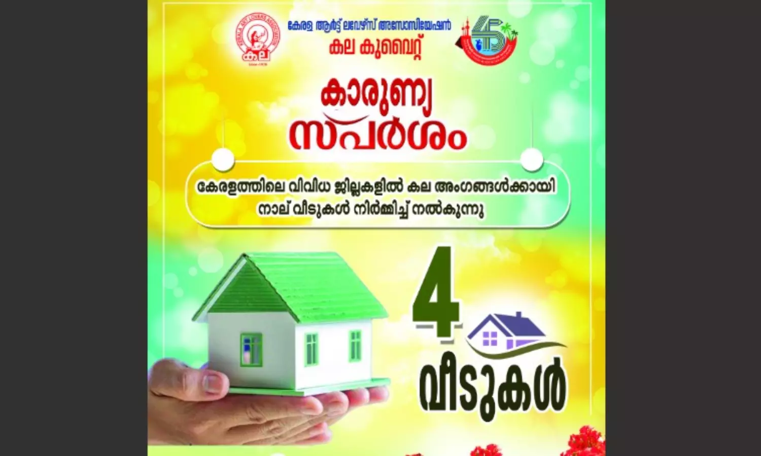 കല കുവൈത്ത്, നാല്പത്തഞ്ചാമത് വർഷത്തെ പ്രവർത്തനങ്ങളുടെ ഭാഗമായി കേരളത്തിലെ വിവിധ ജില്ലകളിലായി നാല് അംഗങ്ങൾക്ക് വീടുകൾ നിർമ്മിച്ച് നൽകാൻ തീരുമാനിച്ചതായി കല കുവൈത്ത് ഭാരവാഹികൾ അറിയിച്ചു.