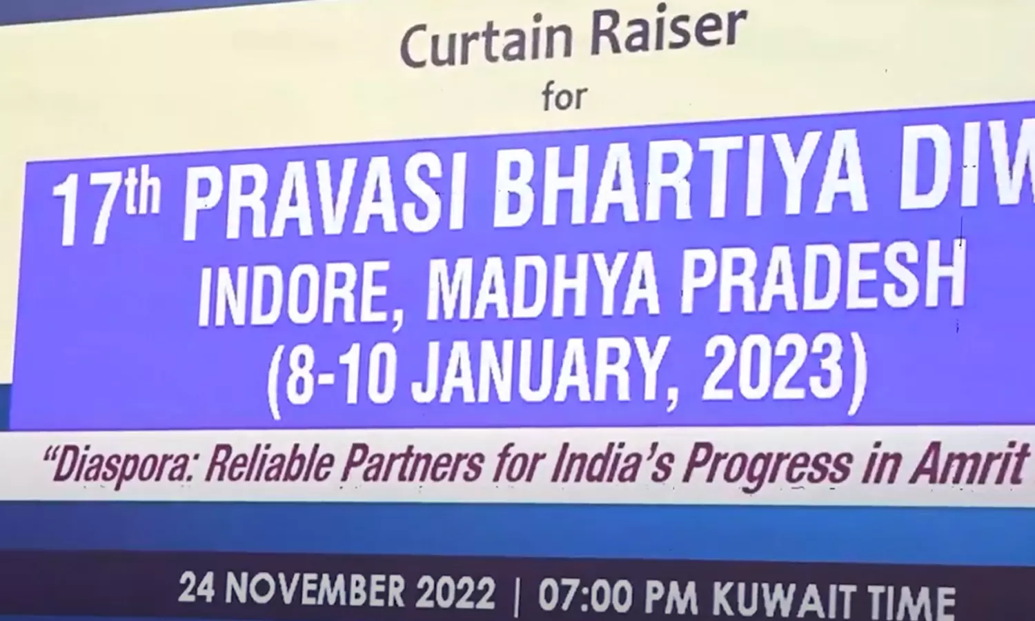 അടുത്ത വര്ഷം ജനുവരി 8 മുതൽ 10 വരെ മധ്യപ്രദേശിലെ ഇൻഡോറിൽ നടക്കുന്ന 17-ാമത് പ്രവാസി ഭാരതീയ ദിവസിന്റെ കർട്ടൻ റൈസർ പരിപാടി ഇന്ത്യന് എംബസ്സിയില് സംഘടിപ്പിച്ചു. വിദേശകാര്യ മന്ത്രി എസ് ജയശങ്കരും കുവൈത്തിലെ പ്രമുഖ ബിസിനസ് - സംഘടന പ്രതിനിധികളും ഓണ്ലൈനായി ചടങ്ങില് പങ്കെടുത്തു.