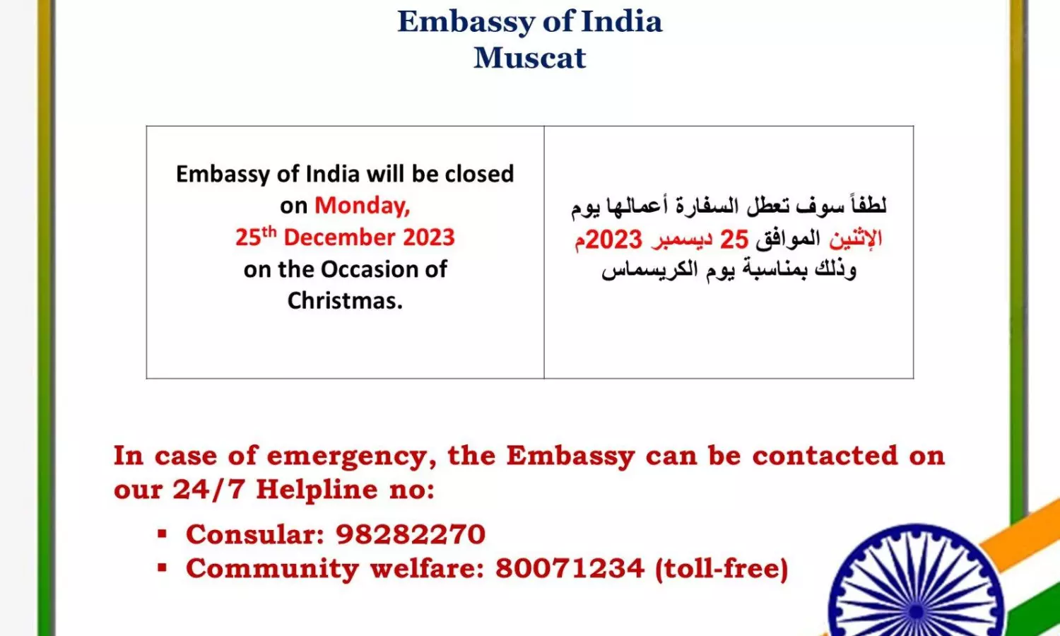 ക്രിസ്മസിന്റെ ഭാഗമായി മസ്കത്ത് ഇന്ത്യന് എംബസിക്ക് തിങ്കളാഴ്ച അവധിയായിരിക്കുമെന്ന് അധികൃതര് അറിയിച്ചു. കോണ്സുലാര് സേവനങ്ങള്ക്ക് 98282270 എന്ന നമ്പറിലും കമ്യൂണിറ്റി വെല്ഫെയര് സേവനങ്ങള്ക്ക് 80071234 (ടോള് ഫ്രീ) എന്ന നമ്പറിലും ബന്ധപ്പെടാവുന്നതാണ്. ഇന്ത്യന് എംബസിയുടെ ഹെല്പ്പ്ലൈന് സേവനം 24 മണിക്കൂറും ലഭ്യമാകും.