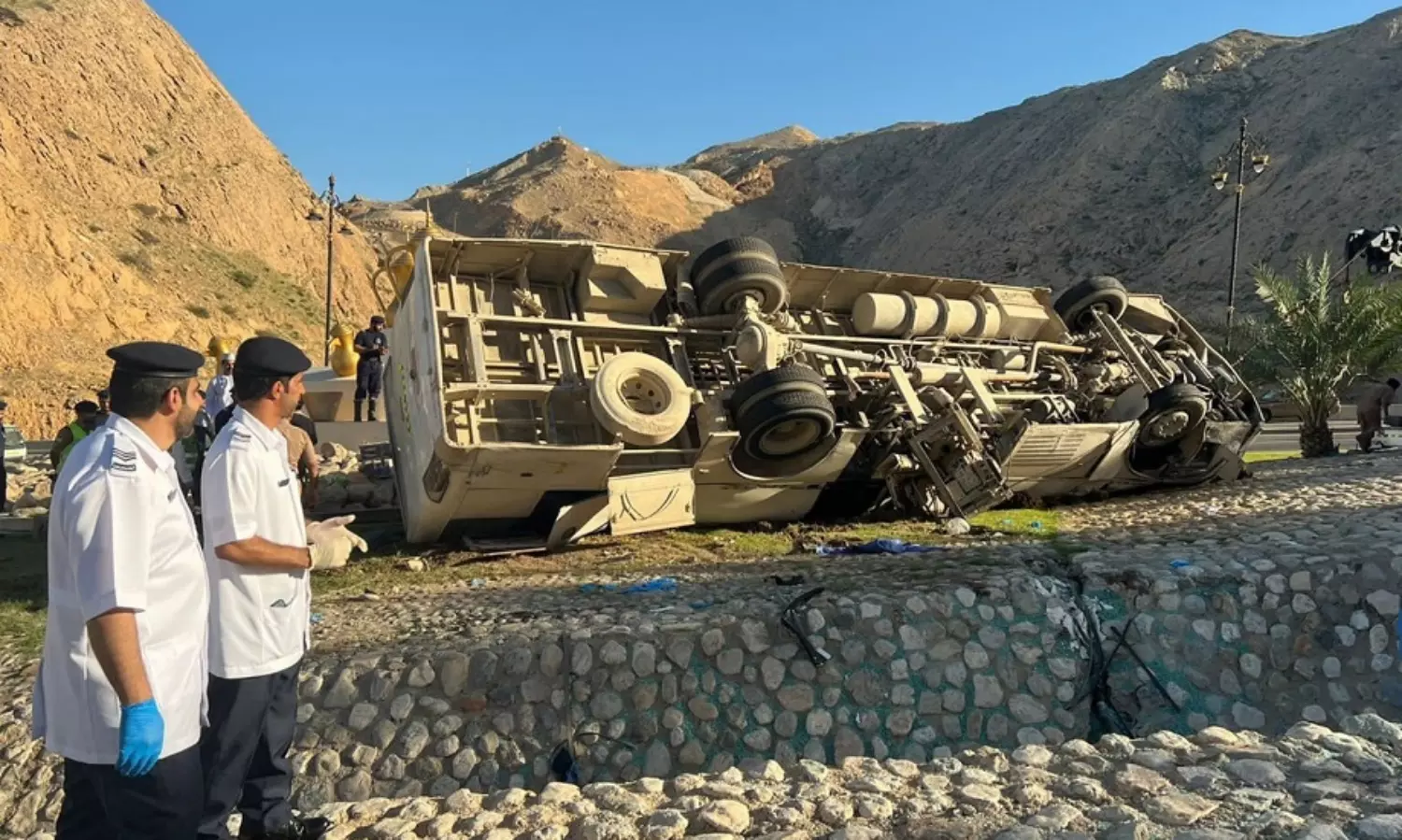 അഖബ ഖന്തബിൽനിന്ന് അൽ ബുസ്താൻ റോഡ് വാദി അൽ കബീറിലേക്കുള്ള എക്സിറ്റിലാണ് ബസ് മറിഞ്ഞത്. 53 പേരാണ് ബസിലുണ്ടായിരുന്നത്. നിരവധി പേർക്ക് പരിക്കേറ്റിട്ടുണ്ടെങ്കിലും 4 പേരുടെ നില ഗുരുതരമാണ്.