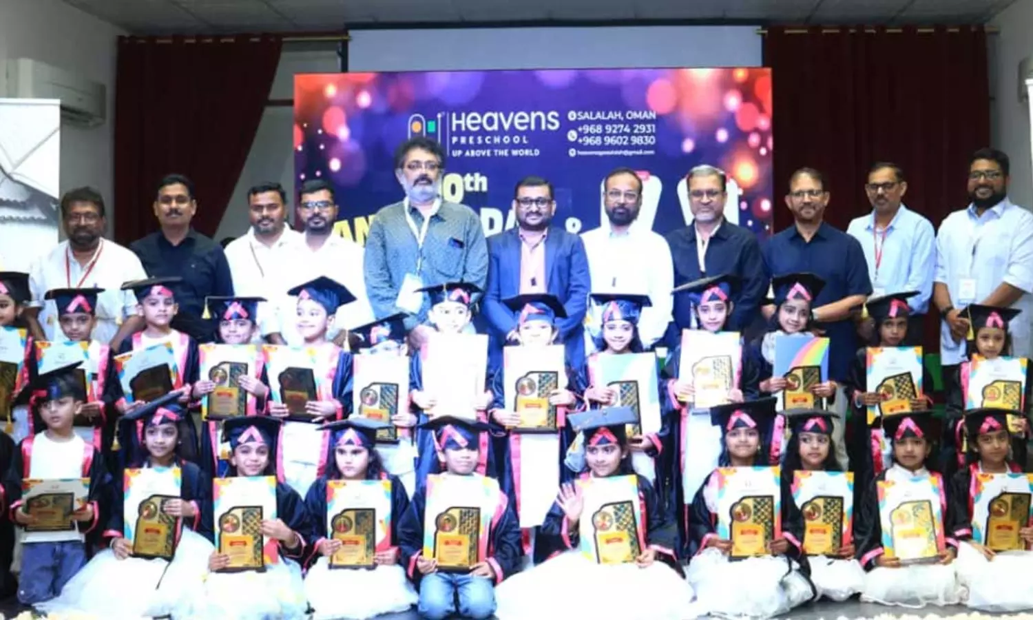 സലാല: സ്വകാര്യ വിദ്യാഭ്യാസ സ്ഥപനമായ ഹെവൻസ് പ്രീ സ്കൂൾ സലാലയിൽ പത്താം വാർഷികം ആഘോഷിച്ചു. ഐഡിയൽ ഹാളിൽ നടന്ന പരിപാടിയിൽ പ്രീ സ്കൂൾ ബിരുദ ധാനവും നടന്നു. യൂണിവേഴ്സിറ്റി ഓഫ് ടെക്നോളജി ആന്റ് അപ്ളൈഡ് സയൻസിലെ ഡോ: അബ്ദുൽ റഅൂഫ് അഹമ്മദ് പരിപാടി ഉദ്ഘാടനം ചെയ്തു. ഐഡിയൽ എജ്യുക്കേഷൻ സെന്റർ ചെയർമാൻ കെ.ഷൗക്കത്തലി മാസ്റ്റർ അധ്യക്ഷത വഹിച്ച പരിപാടിയിൽ മുഹമ്മദ് സിയാദ്, അൽ അമീൻ, നാസർ പെരിങ്ങത്തൂർ, മുസാബ് ജമാൽ എന്നിവർ സംബന്ധിച്ചു. വിദ്യാർഥികൾക്ക് സർട്ടിഫിക്കറ്റും ഉപഹാരങ്ങളും നൽകി.