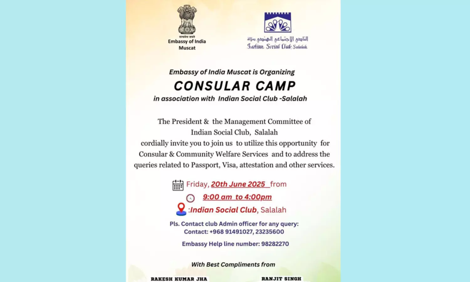സലാലയിൽ ഇന്ത്യൻ എംബസി കോൺസുലർ ക്യാമ്പ് ജൂൺ 20ന്