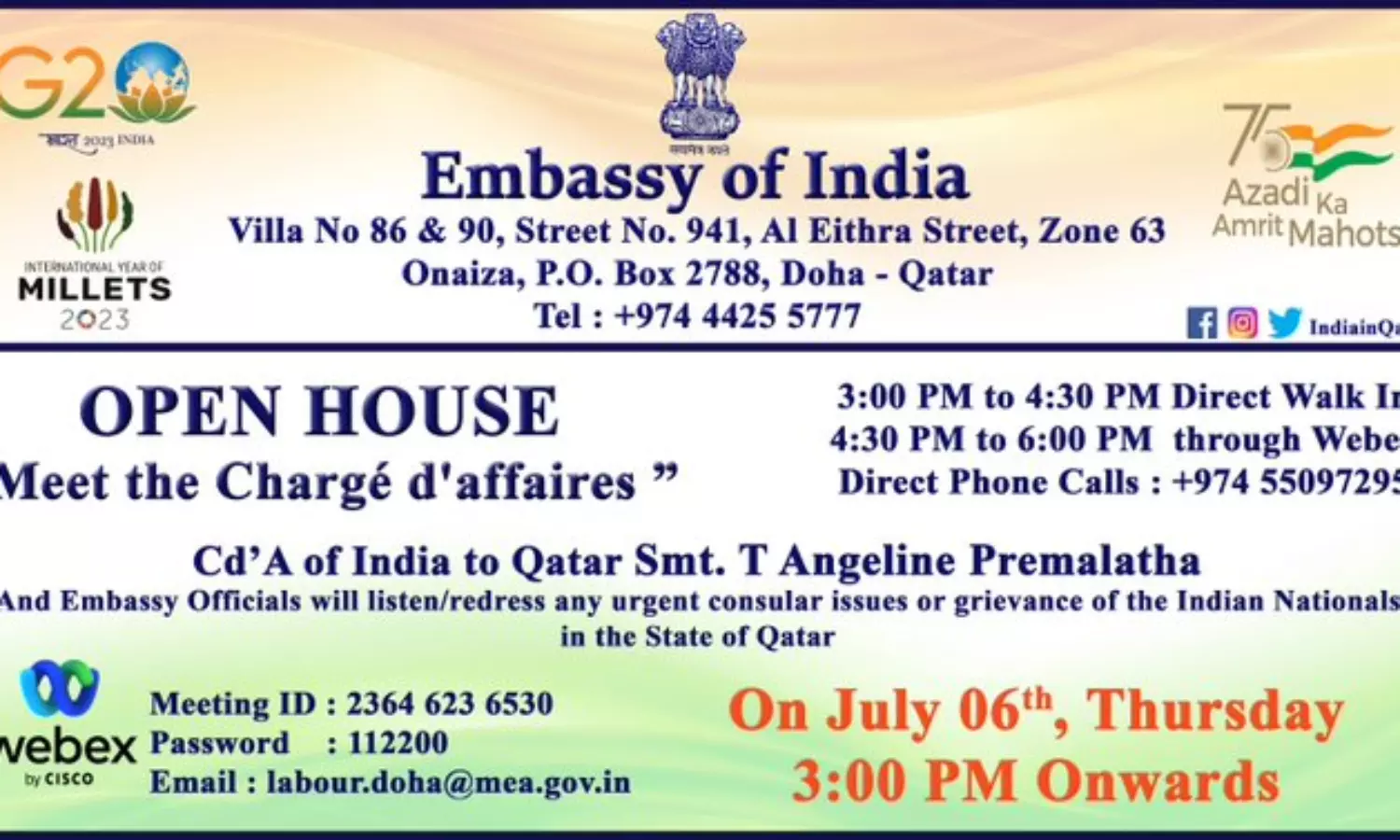 പരാതികള് എംബസി ചാര്ജ് ഡി അഫയേഴ്സ് ടി. ആഞ്ജലീന പ്രേമലത നേരിട്ട് സ്വീകരിക്കും. എംബസിയില് നേരിട്ടെത്തി വൈകിട്ട് മൂന്ന് മുതല് നാലര വരെ ഓപ്പണ് ഹൌസില് പങ്കെടുക്കാം. ഓണ്ലൈന് വഴി നാലര മുതല് ആറ് വരെയാണ് ഓപ്പണ് ഹൌസ് നടക്കുക.