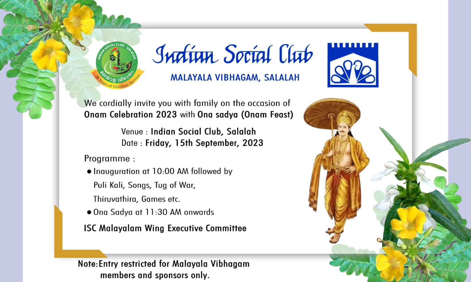 ഇന്ത്യന് സോഷ്യല് ക്ലബ്ബ് മലയാള വിഭാഗം സലാലയിൽ സംഘടിപ്പിക്കുന്ന ഓണാഘോഷം സെപ്തംബര്15 വെള്ളി രാവിലെ പത്തിന് ഇന്ത്യന് സോഷ്യല് ക്ലബ്ബ് ഹാളില് നടക്കും.
